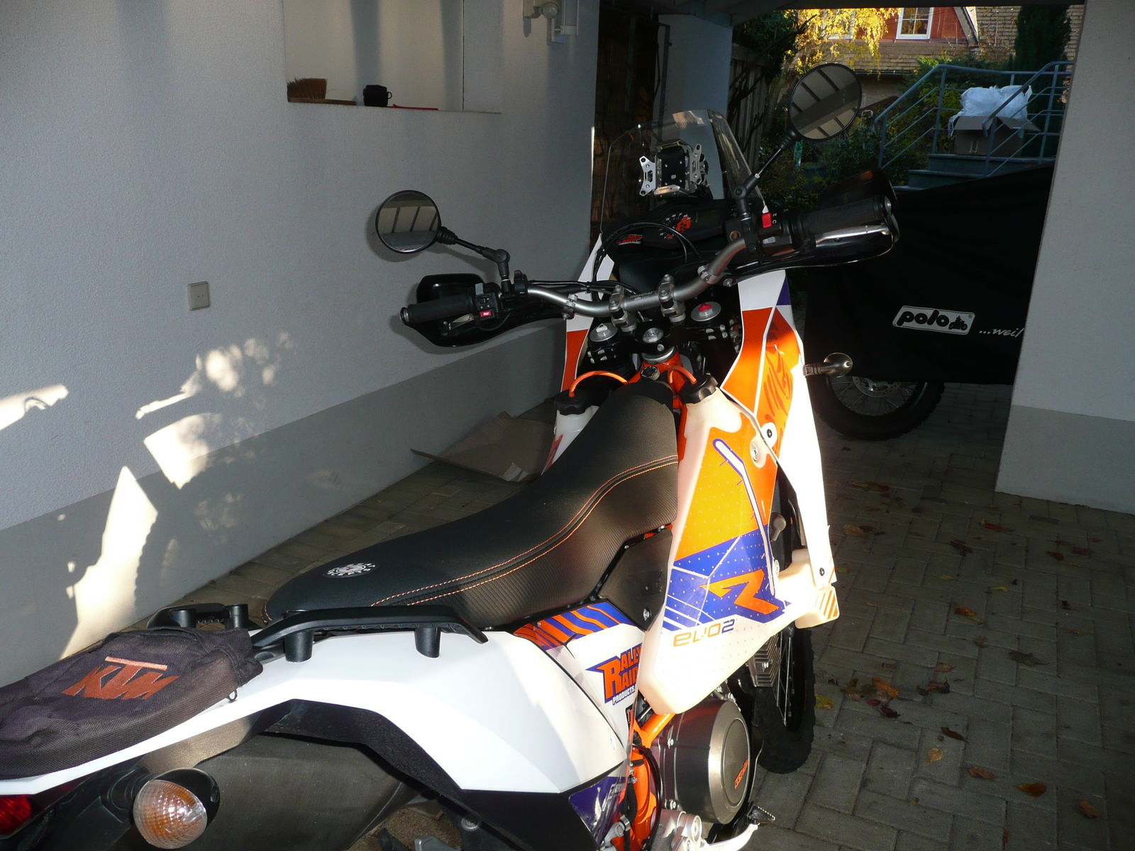 ...und so sieht die klare Maske an meiner 690RallyRaid nun aus. Leider steht sie etwas unter Spannung an den obersten zwei Verschraubungen, das werde ich aber leicht nacharbeiten können. Auch die neue Sitzbank von Seat-Concepts ist nun drauf. Sehr rutschfester Bezug, die Seitenteile carbonfaserverstärkt, orange Zierdoppelnaht, Sitzschale deutlich stabiler als Serie, plug and play. Für 426 Euro (inkl. Versand) aus Dänemark bezogen, weil sie dort am Lager war. Standardhöhe, ist aber rund 1cm höher als die Seriensitzbank (ab 2014). Freue mich auf die Probetour, wenn der Nebel mal verschwindet... Smile