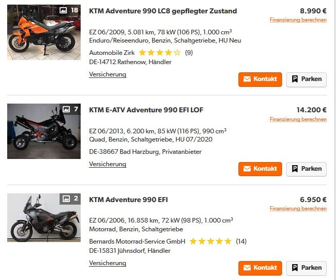 Der Freundschaftspreis für Deine 990er ist sehr sympathisch, freut mich für Dich! Wobei ich denke, man darf hier nicht die Wunschpreise aus Mobile und Co. als Maßstab anlegen. Ich kenne zwar nicht die realistischen Gebrauchtpreise in F oder auch in Ö, aber eine Inzahlungnahme einer 10-jährigen Adventure mit 80tsd auf dem Buckel dürfte sich auch knapp unterhalb 3000 Euro ansiedeln. Andersherum gefragt: bietet mir wer 4500 Euro für meine sehr gepflegte 950S aus 2003 mit 87tsd? Ich könnte schwach werden! OK, vielleicht nur...!