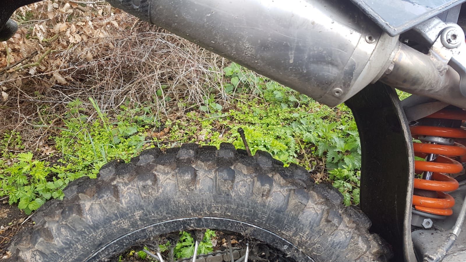 Zurück im Basislager geht die 640 weiter an Pezel - seine @ fährt wegen defekter Gabel wie ein Schaukelpferd.