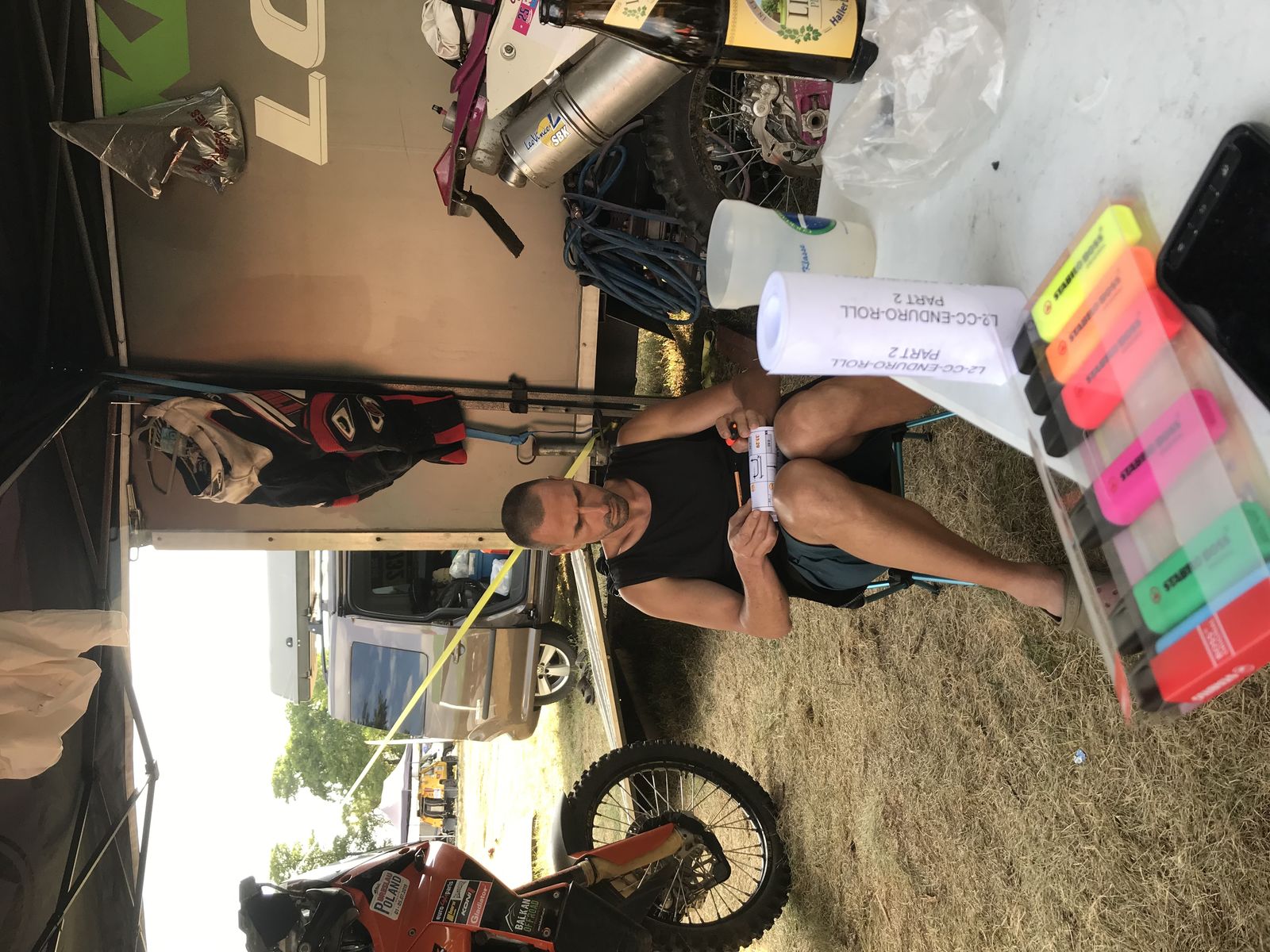 Robbe hat zum Glück wieder eine ToDo Liste gemacht die am Anhänger hängt, “Arbeiten nach dem Rennen“ und „Vorbereitung vor Abfahrt“, die es einem erleichtern und die Aufregung des Vergessens nehmen.