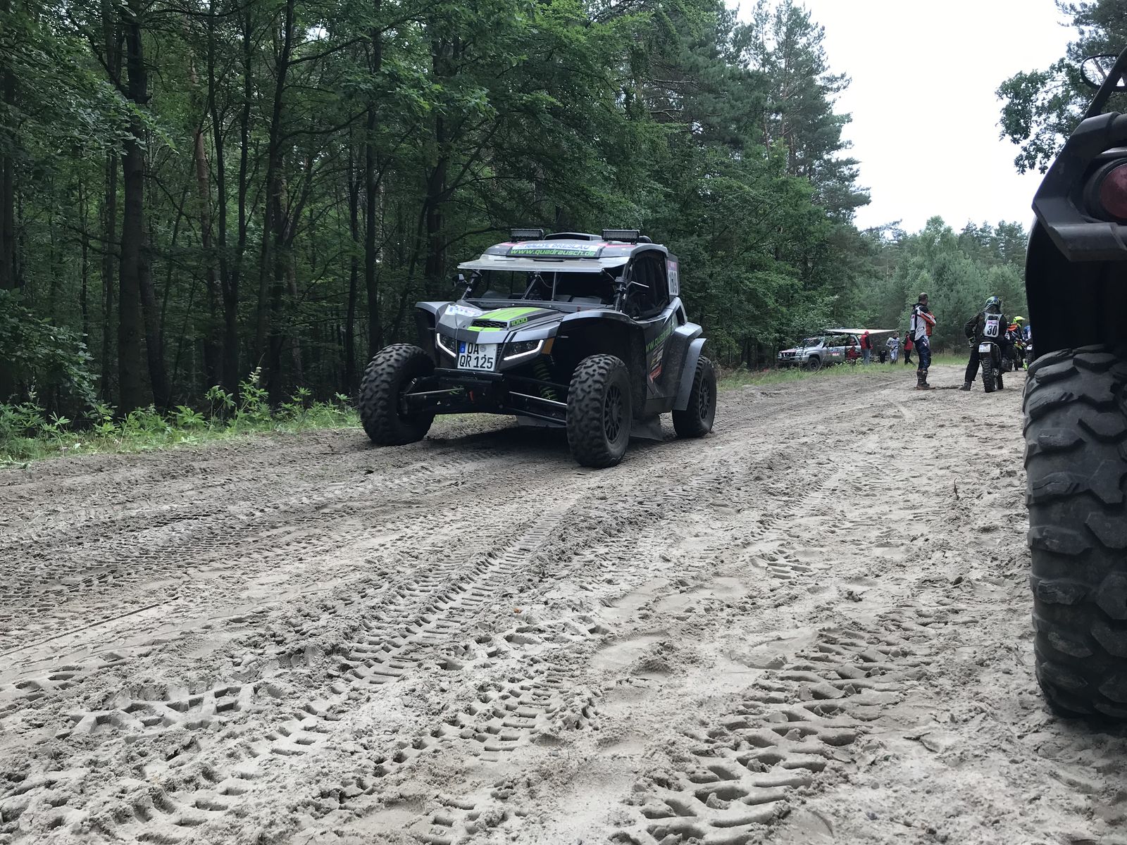 Auf einer abgeholzten Lichtung sehe ich wie der Quadfahrer nach einem kurzen Rückblick nach links die Spur frei macht.