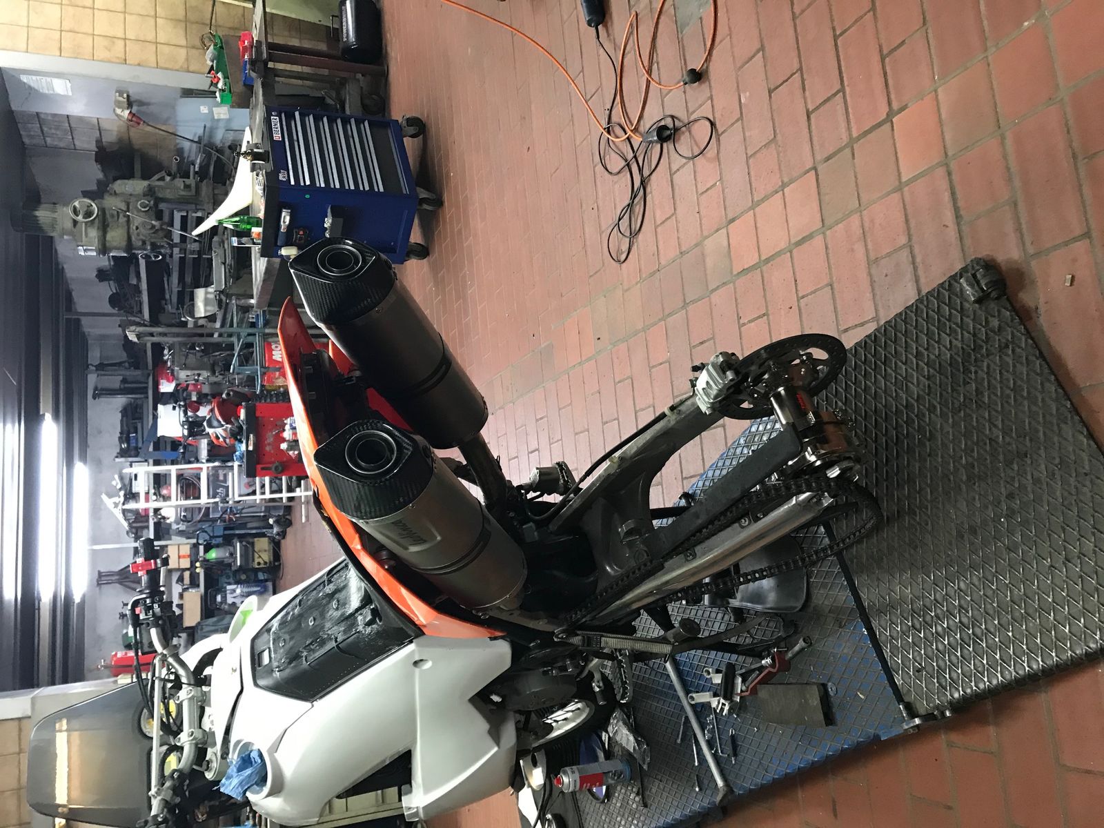 Einen EXC Seitenständer habe ich dran. Nicht angeschweißt. Habe ich mich nicht getraut. Habe eine Halterung ähnlich wie bei der Seitenständerverlegung gebaut. Ein Bild stelle ich noch ein.