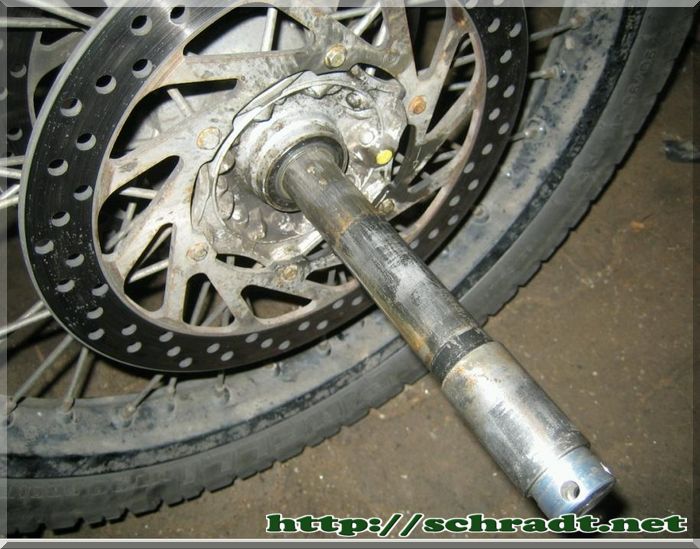 Ich habe grade mein Vorderrad gewechselt. Diesmal mit drei Schraubendrehern (zwei in den Klemmfäusten, einer im Achsausziehknubbel[tm]), einem 500g Hammer, einer 21er Nuß, einer 1/2" Verlängerung und ner Dose Karamba
