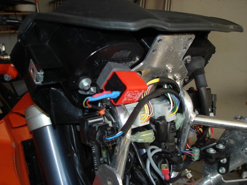 Als Relais habe ich das elektronische Ding von Louis genommen. Ich hab' das Relais mit an die eine Drehzahlmesser - Befestigungsschraube geschraubt ! Die Stoppmutter hatte trotzdem noch "Grip". Zudem brauchte ich an der Stelle die Original-Anschlusskabel nicht zu verlängern. Auch sitzt das Relais da oben super geschützt.
