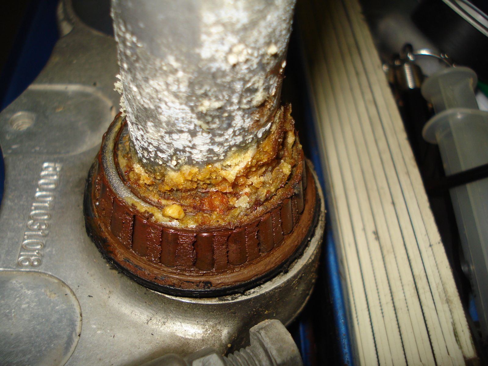 | Das Lager mit einer 1mm Inox-Flexscheibe einschneiden und dann mit einem kleinen Meissel knacken.