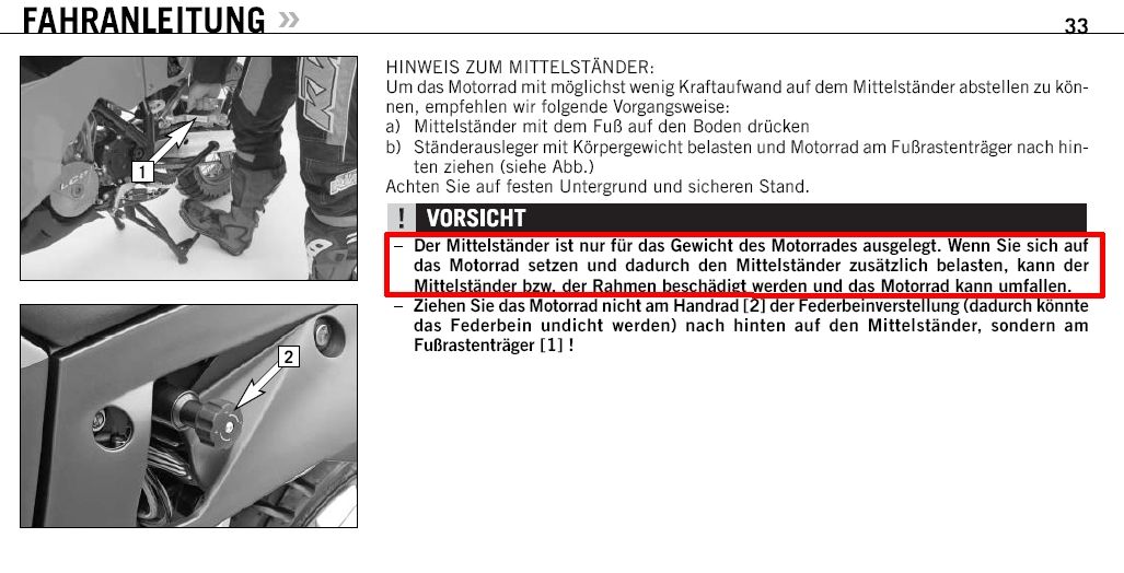 Viel witziger find ich ja die 2te Warnung, das Motorrad nicht mit der Federbeinverstellung auf den Ständer zu hieven... Laughing