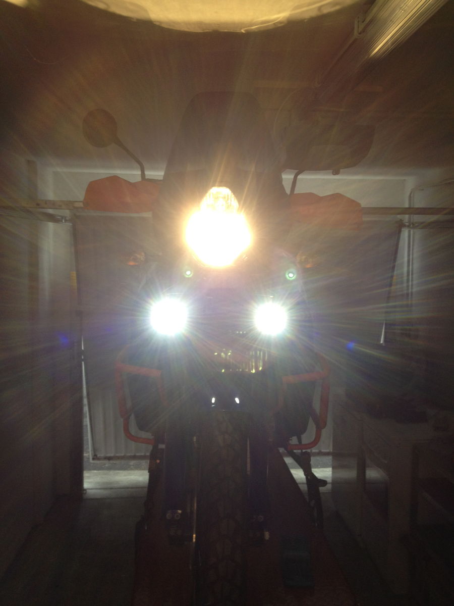 Sieht gut aus, obwohl keine LED (lediglich H3 Halogen Leuchten), aber der Preis ist relativ freundlich und der Anbau auf Sturzbügel gefält mir ganz gut.
