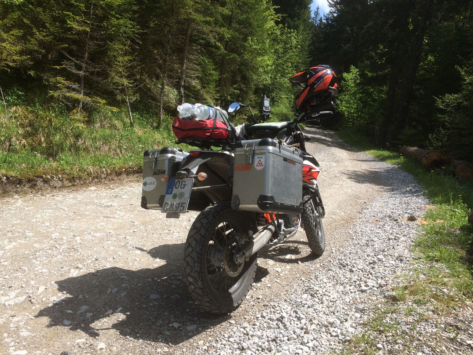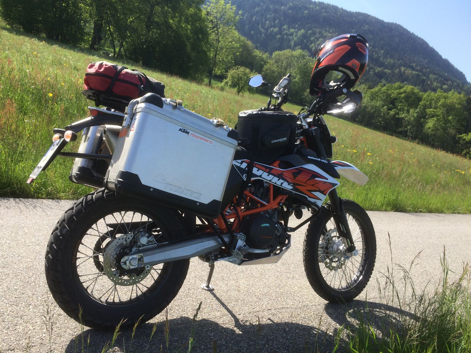 Tankrucksack: habe den grossen Enduristan Sandstorm 3E von der 990@ rübergebaut. Stört ein bissel beim Stehendfahren, aber vorerst belasse ich das dabei.
