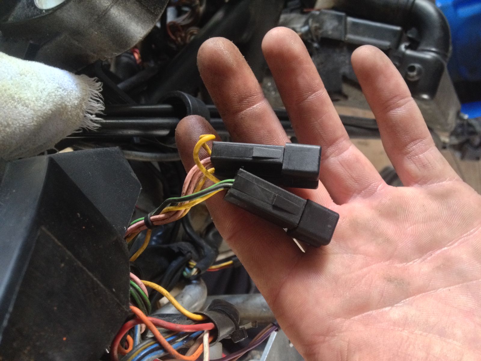 Der erste (helle) Stecker könnte der Anschluß für den tripmaster-schalter sein! Das Ding ist hell, hat vier Pole und abgerundete Ecken.... Wenn du keinen tripmaster-schalter dran hast, dann bleibt das teil unbelegt.