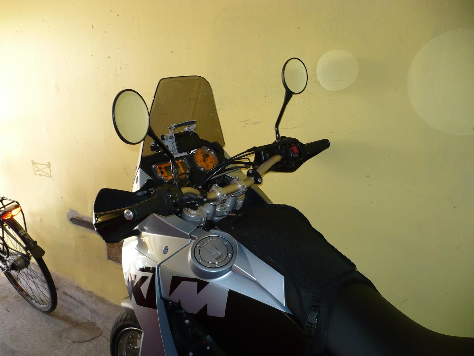 Umbauten: Zunächst die normale 3cm-Lenkererhöhung von KTM. Angenehm zu fahren im Sitzen, aber da sie die Neigung der Gabel auf den Fahrer zu verlängert, zu dicht am Fahrer im Stehen. Mittlerweile habe ich die 3cm-Tieferlegung der Fußrasten drauf - hätte ich viel früher machen sollen. Und seit Anfang des Jahres die hohe Lenkererhöhung von Hosi, die den Lenker nicht nur hoch, sondern auch vor verlegt. Zum Fahren im Sitzen etwas sehr hoch, zum Fahren im Stehen großartig. Und Umbau auf S-Fahrwerk mit 265cm - das hat zwar keine Auswirkung auf das Dreieck Fahrer-Sitzbank-Lenker, erleichtert aber das flotte Offroaden ungemein.