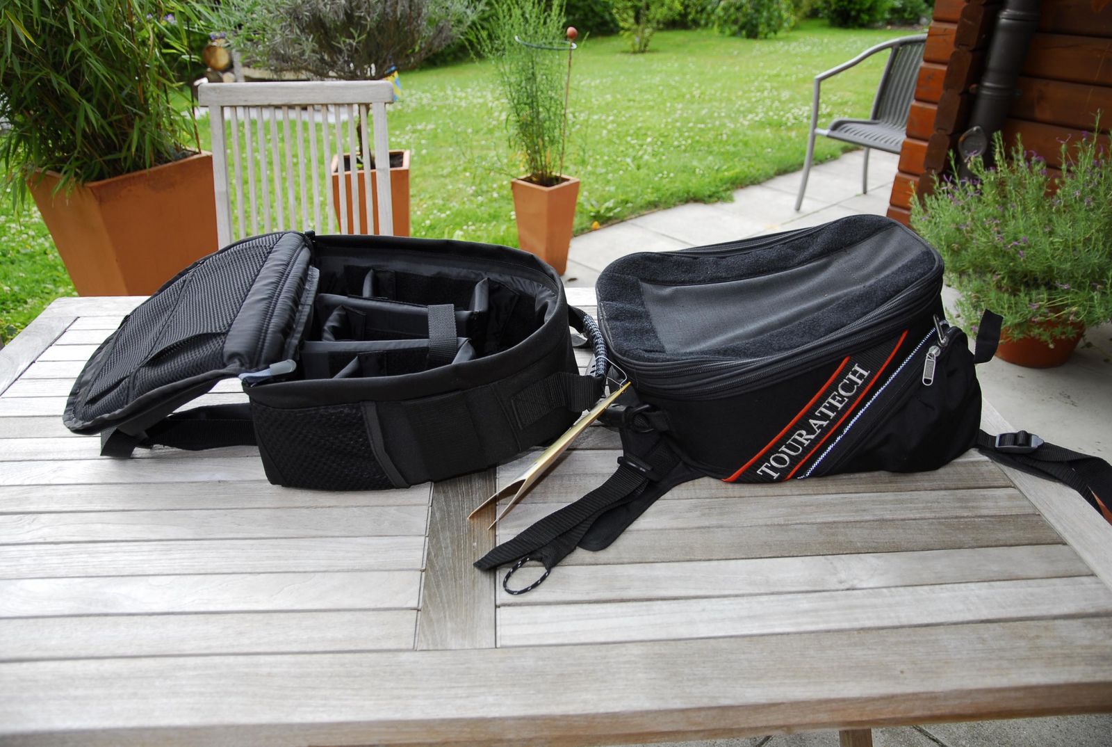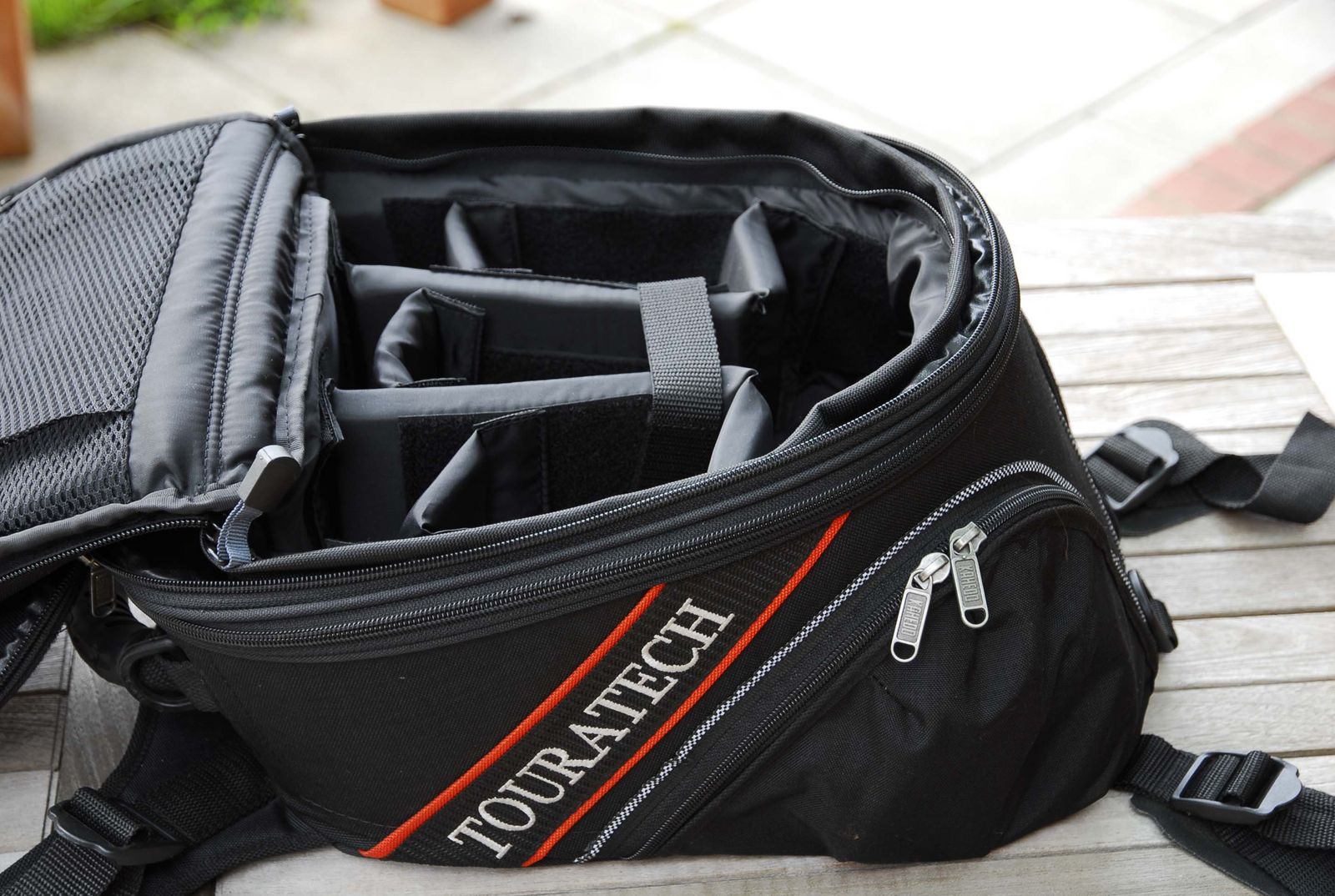 Ich habe den Touratech Tankrucksack für die LC8 ohne Foto-Einsatz. Die dicke Canon ist gepolstert eingewickelt, die Objektive auch. Unter der Kamera liegt das Netbook. Im trauten Gewühl mit Kamera und Objektiven liegen das Multipurpose-12V-Ladegerät und schnell zur Hand benötigter Kleinkram.