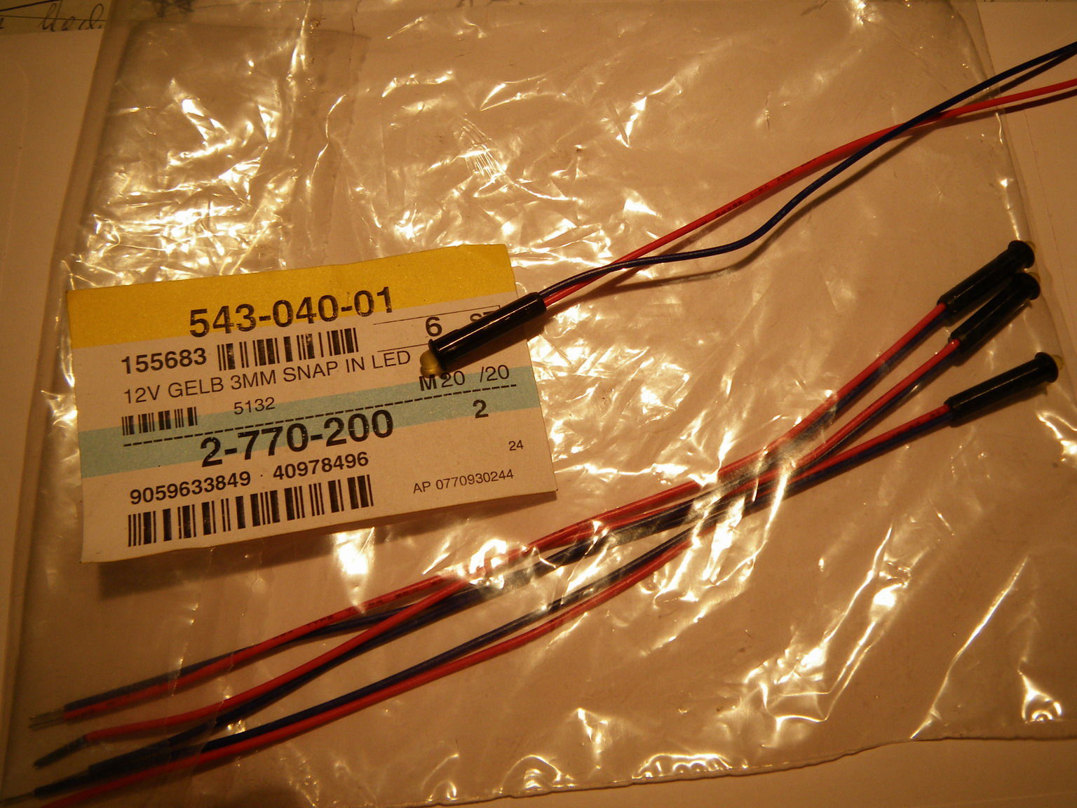 Achtung die Werte hier sind für MEINE BENUTZE DIODE 2,2 V / 20 mA !!! Bitte Eure eigenen Werte einsetzten und den Widerstand in Reihe an die Diode löten und ggf. nen Schrumpfschlauch drüber.