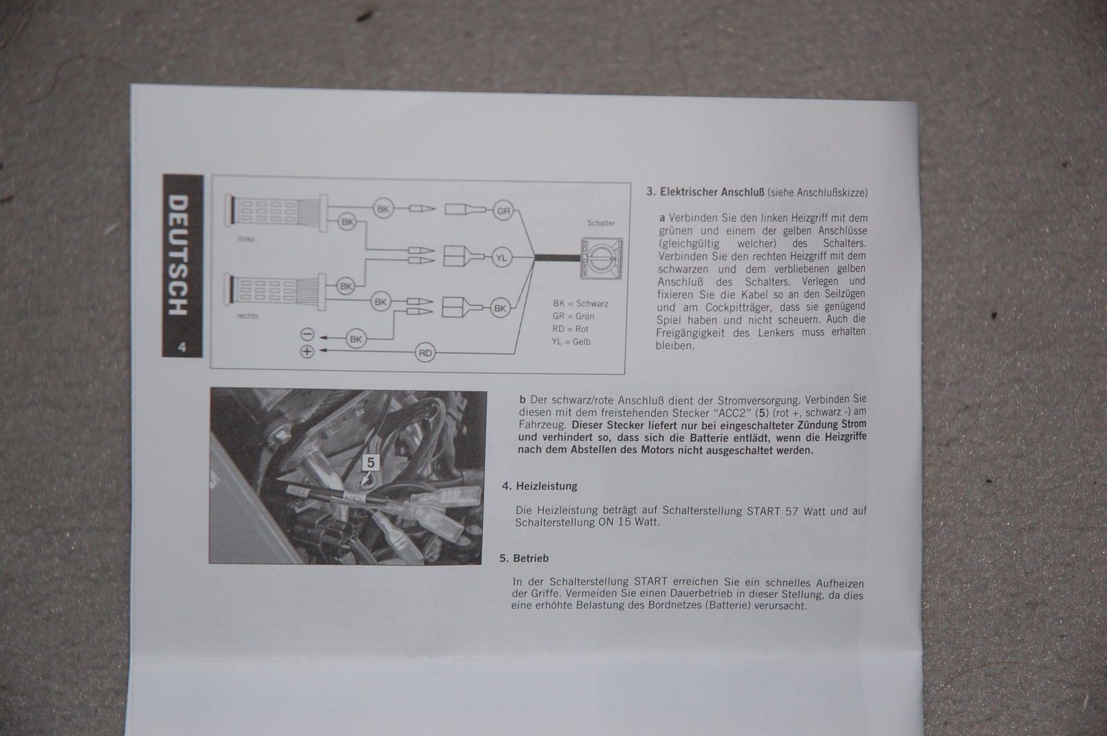 Obwohl schon so viele Antworten eingegangen sind, daß alle die nicht mit Elektrik im Blut geboren sind sich ausklinken: Hier noch die Anleitung (orischinol)! Habe mir übrigens das GHZ-Modul dazu bestellt. Um Enttäuschungen vorzubeugen, am besten vor Einbau den Thread mit der Heizgriffregelung genau durchlesen- weil wenn installieren, dann gleich richtig: Macht mehr Spaß als zweimal basteln Cool