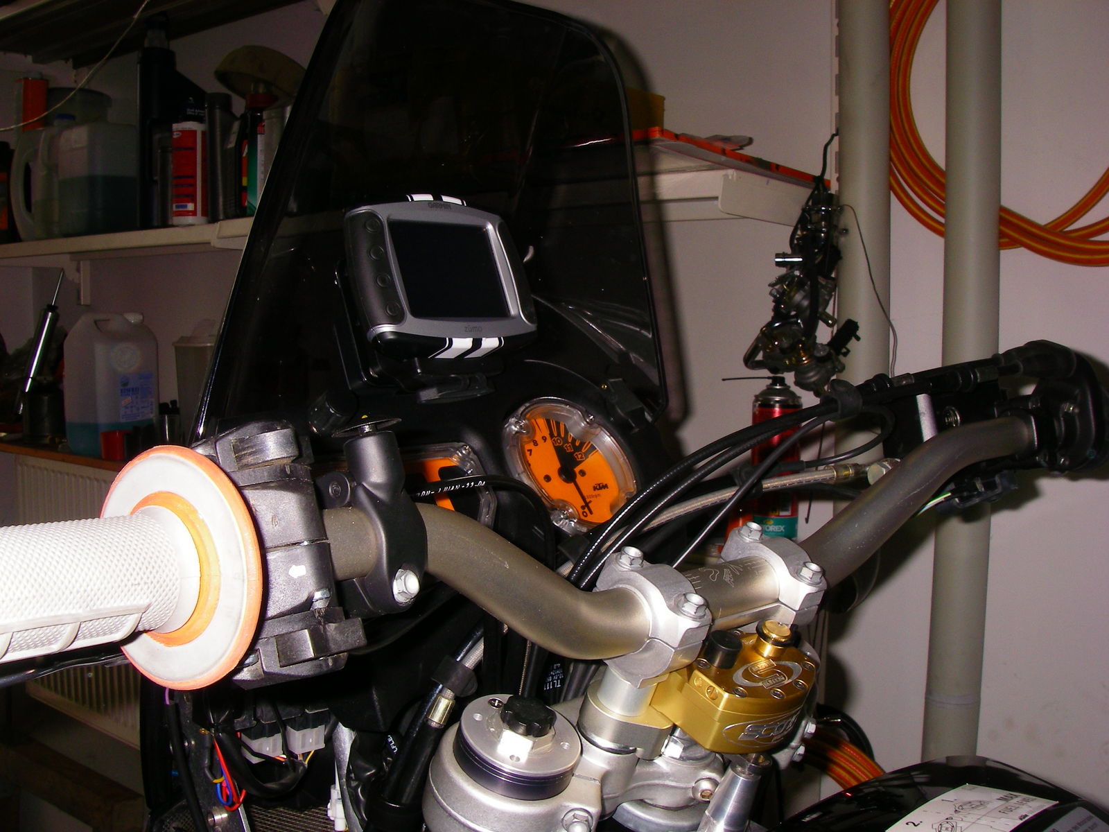 Nimm die ober Brücke der LC4 Enduro ab 2000. Passt original drauf. Alle Gewinde sind identisch zur LC8. Kannste gelegentlich in der Bucht schießen. Damit kommt der Lenker je nach Erhöhung bis zu 3cm weiter nach vorne. Da brauchste auch keine Angst vor dem Tüv zu haben, da originale KTM-Ware. Wer das sieht, hat selber sowas Mr. Green .