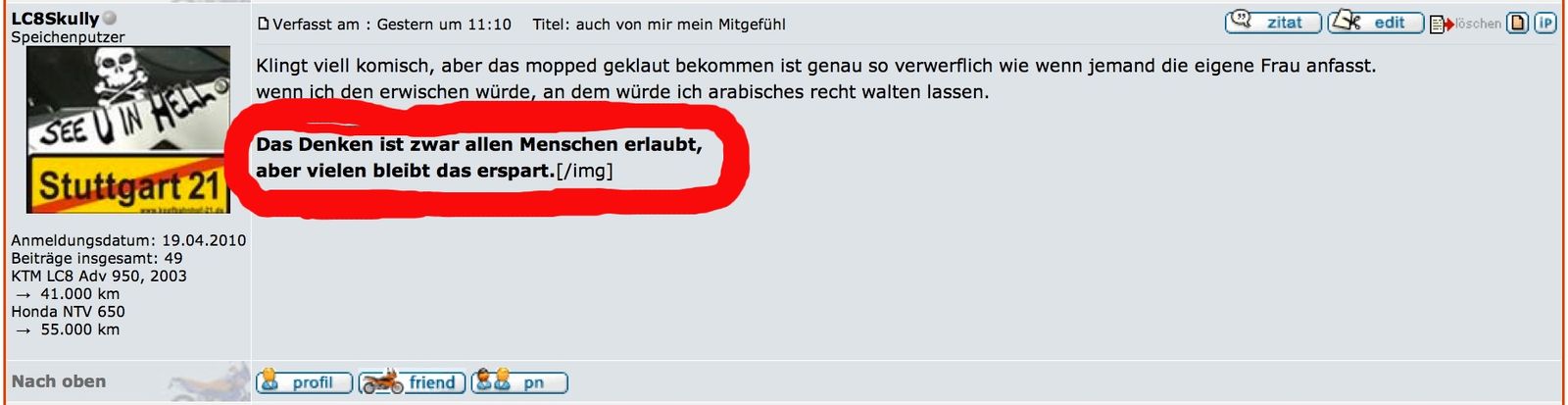 So wie Ingo geht es mir einfach auch. Du steckst viel Schweiß, Arbeit, Zeit und Geld in dein Mopped und so ein Vollidiot klaut sie dir. In Arabien hackt man Dieben die Hand ab. Dieser Spruch soll den Schmerz versinnbildlichen. Wenn du in Arabien die Frau eines Fremden ammachst passiert noch schlimmeres. Das soll versinnblidlichen das man sein Mopped auch "liebt". Ich hoffe das ist nun verstanden. Ich fasse es nicht das ihr eine soziologische Diskussion hier aufmacht und mehr sage ich dazu jetzt auch nicht. Ich halte lieber die Augen auf ob man Teile der geklauten Kiste bei Ebay oder sonst wo im Netz wiederfindet.