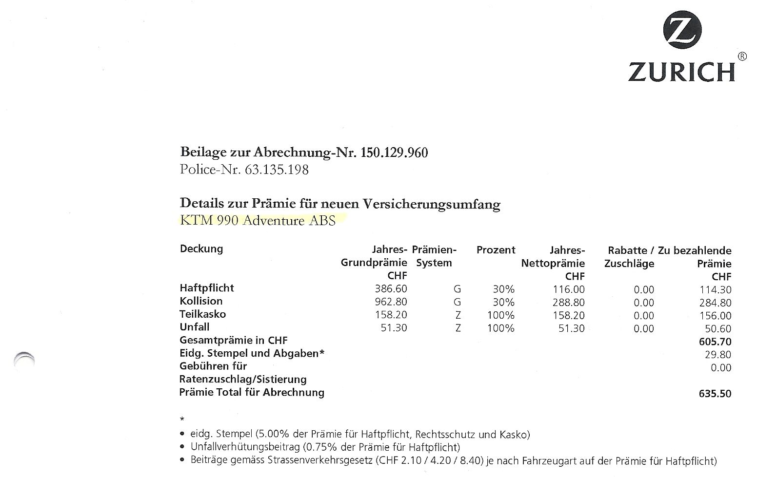 Die XChallenge ist mit einem Wert von 21'000.- Versichert und kostet noch Fr. 512.-. Die Suzuki DRZ 400 hat nur eine Haftpflicht für Fr. 260.-