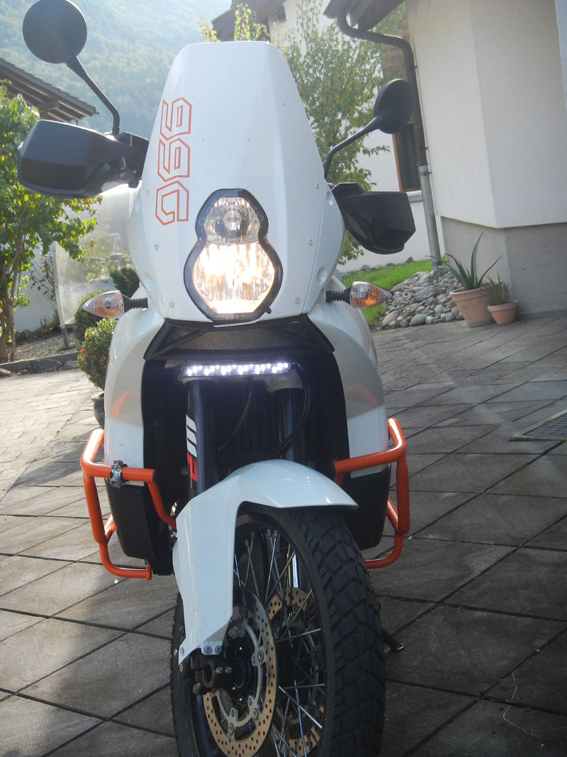 Hab mir mal einen Satz Tagfahrlichter bestellt. Das erste vor 2 Jahren an die XChallenge geheftet. Das Zweite ist jetzt an der @. Das Tagfahrlicht brennt immer bei eingeschalteter Zündung. Und zur Fahrzeugprüfung 2 Schräubchen lösen und den Tamiya-Stecker ziehen, fertig. Nach der Prüfung wieder den umgekehrten Weg. Das geht schneller als den Herren bei der Prüfung etwas zu erklären versuchen.