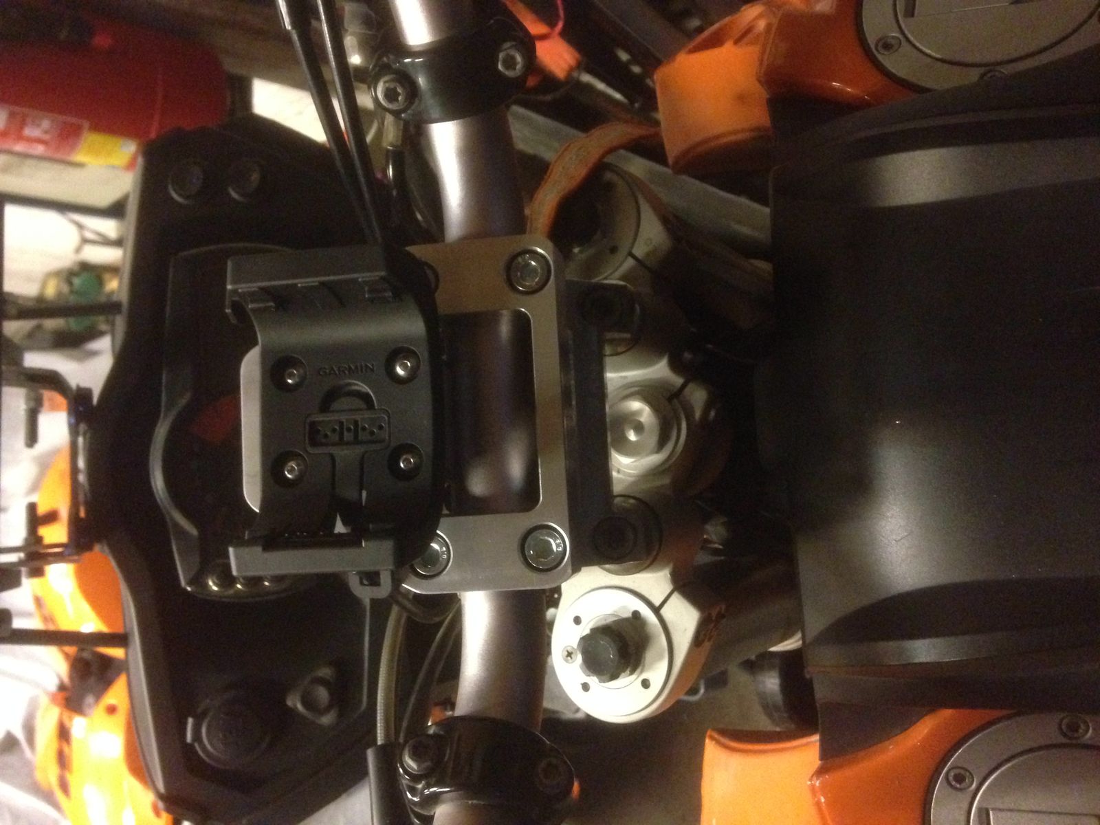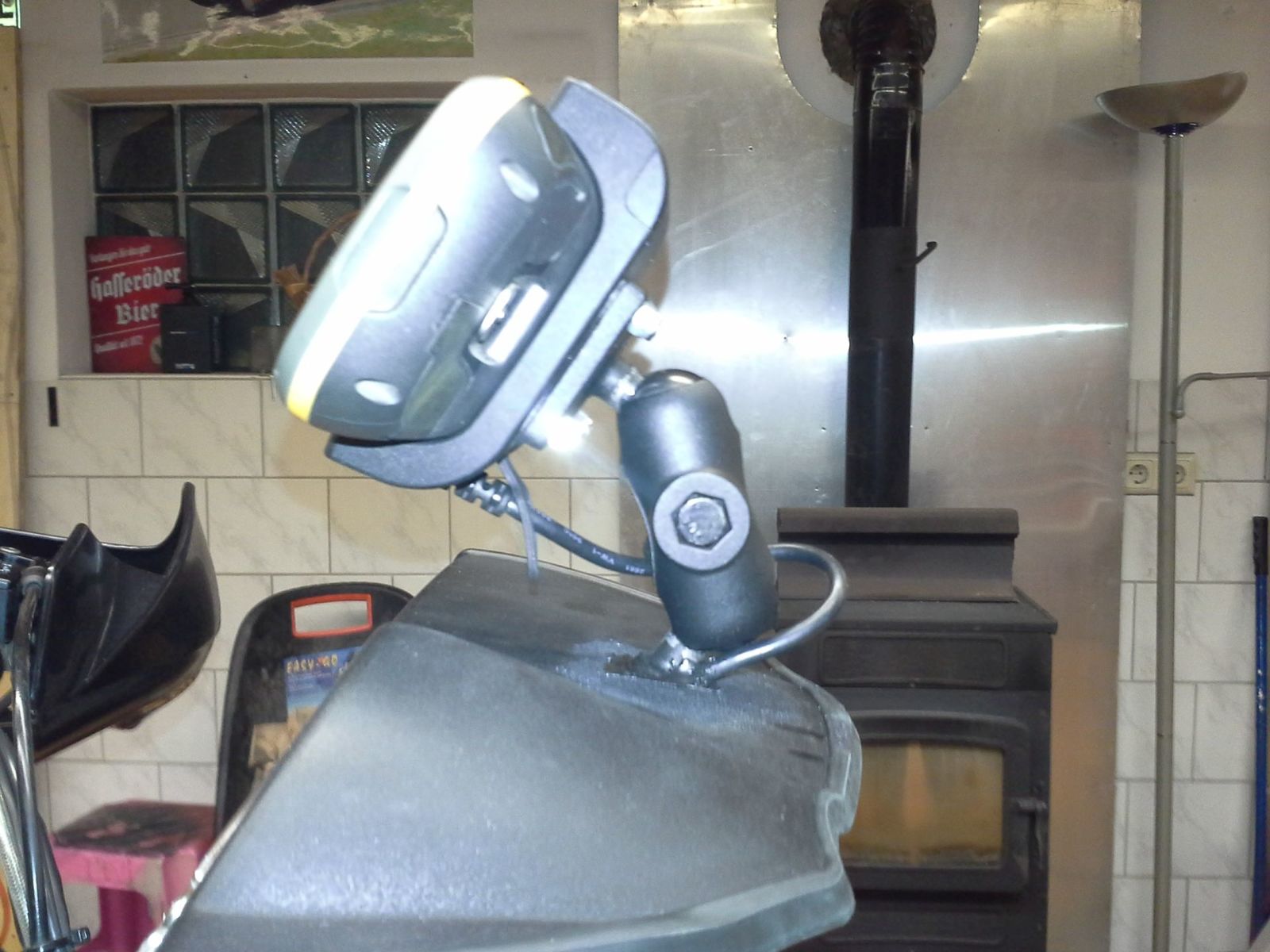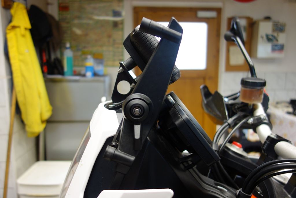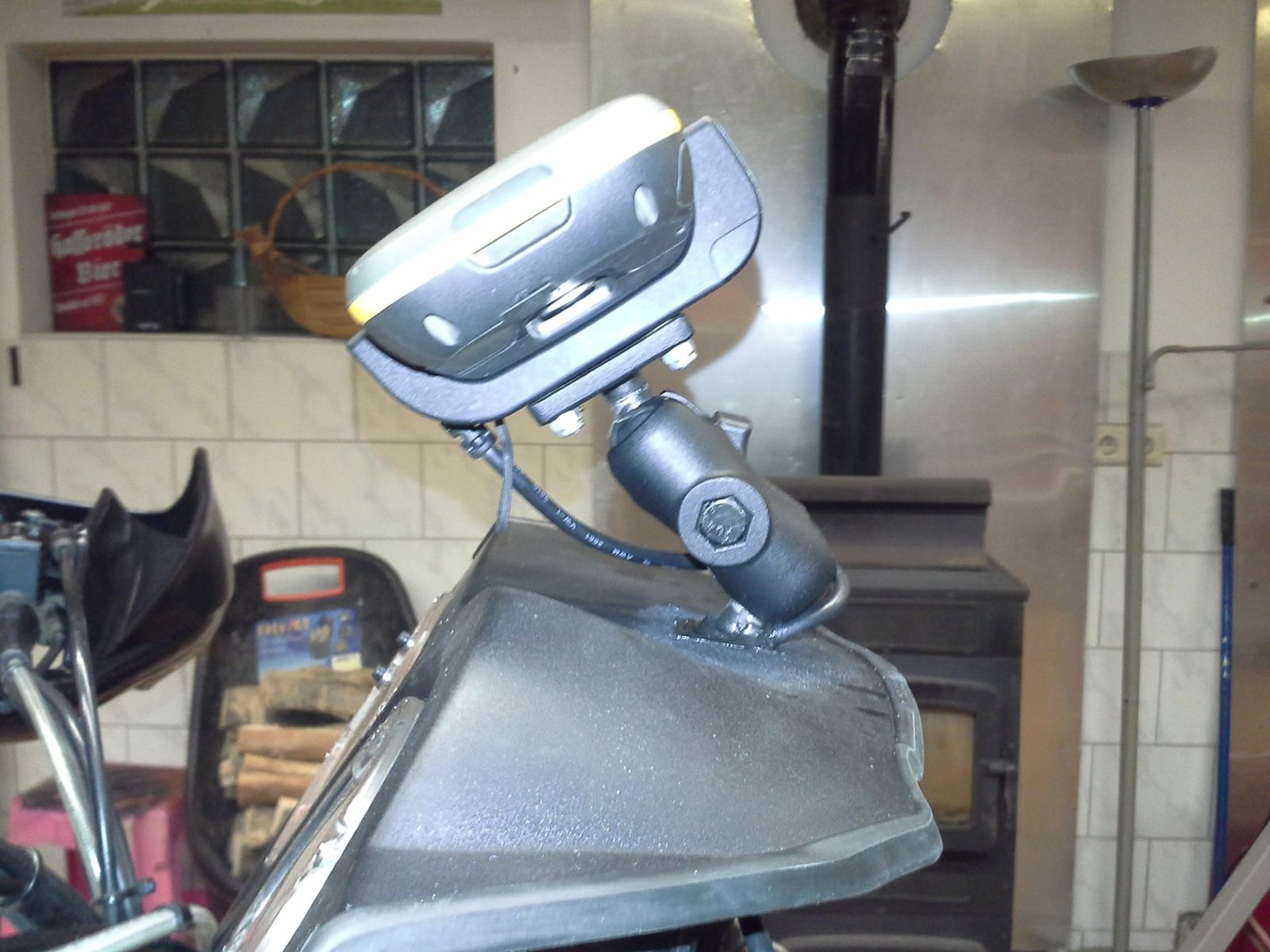 Ich habe eine der beiden oberen Schrauben der Cockpitverkleidung durch einen Ram-Mount-Kugelkopf ersetzt und da die Garmin-Halterung mit Stromversorgung dran.