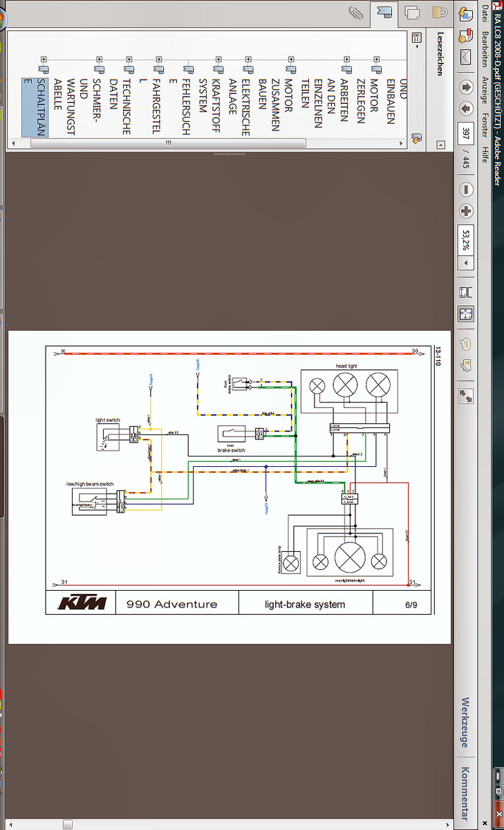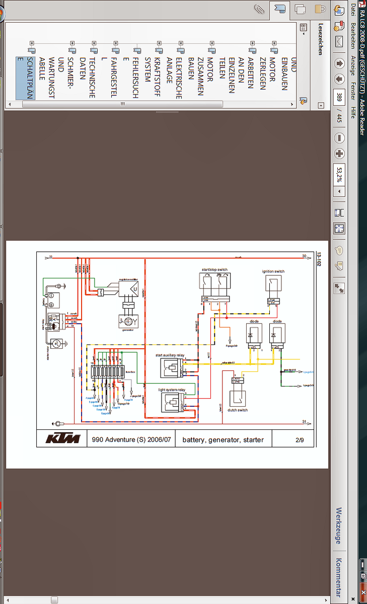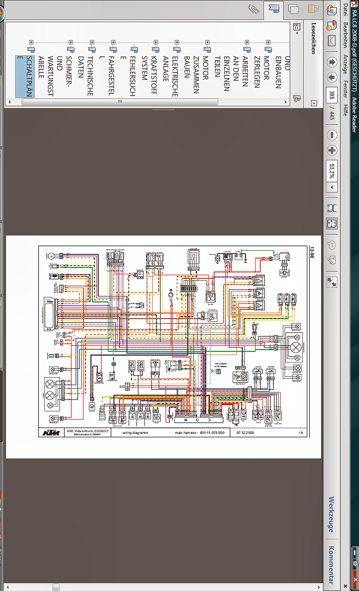 Schwierig von hier aus.... Sad ! Also, ich kann Dir noch den Schaltplan anbieten, von der 990iger ...bis 2007er Baujahr. Also nicht den ab 2007, denn den hab ich bereits hochgeladen. Dieser ummantelte Knick, alle 6 Kabel, direkt am Zündschloß...... wenn Du die bewegst, mit eingeschaltener Zündung....iss ein Unterschied zu bemerken? Oder was Du auch noch machen könntest.....an allen 6 Kabeln vorsichtig zu ziehen, in beiden Richtungen....vielleicht ist eines dabei, bei der die Isolierung länger und länger wird, oder ganz abreißt. unsure