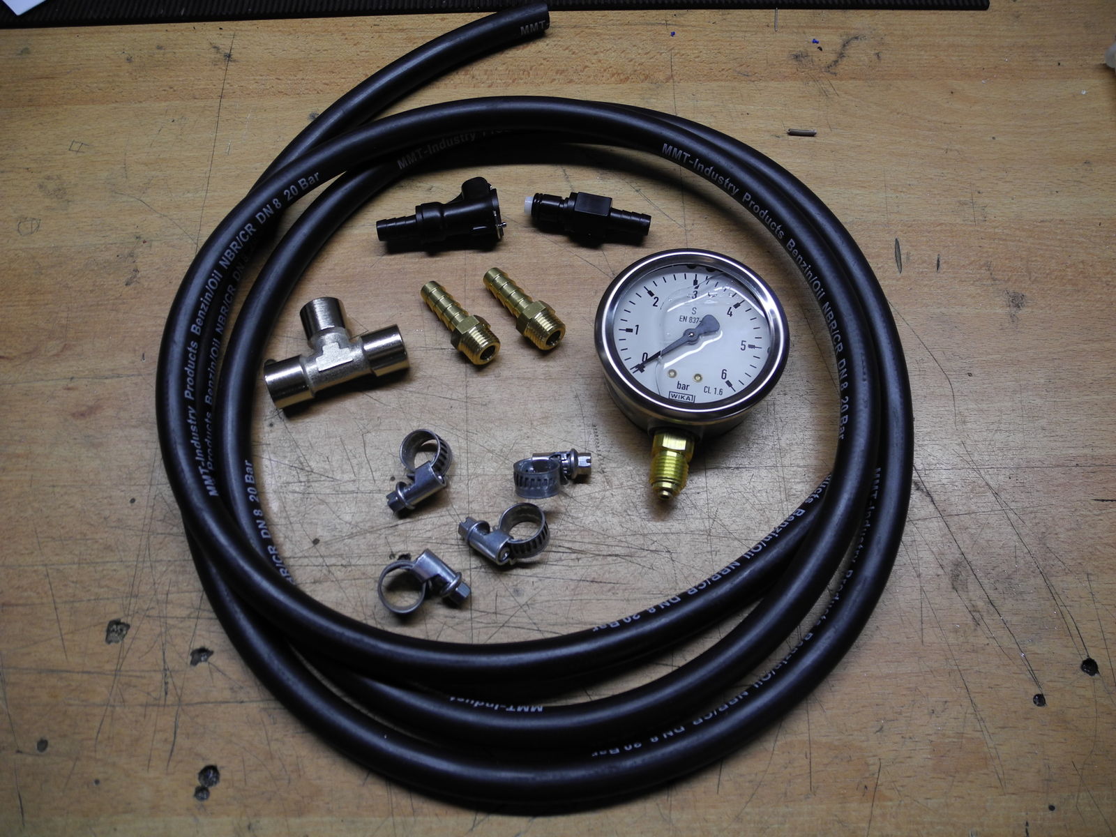 Ich bastle eine Inline-Messung und setze den Manometer mit einem T-Stück und den entsprechenden Schnellkupplungen in die Spritleitung zwischen Pumpe und Einspritzung.