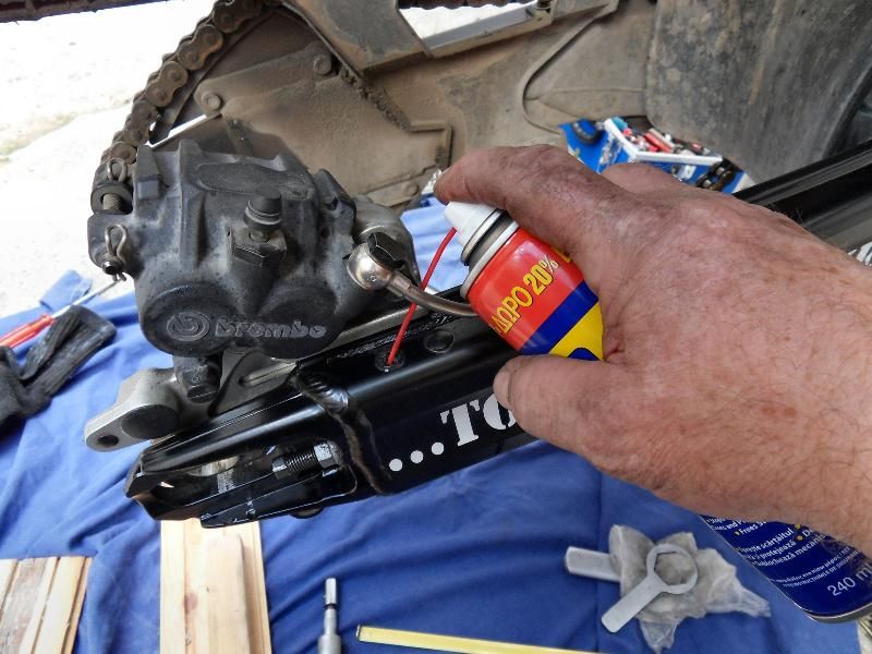 Die rechte Schraube bekomme ich in etwa zu 90% raus, dann ist Schluß. ´Habe aber durch die beiden Löcher in der Oberschwinge, nähe des Bremskörpers, WD ganz fett auf das Schraubengewinde gesprayt....vielleicht geht wieder ein Stückchen nächste Woche. Ansonsten ne Aufgabe für meinen Mech bei dem nächsten Service (werde sicherheitshalber so ne Schraube bestellen, falls sie abgerissen wird....ausbohren?)