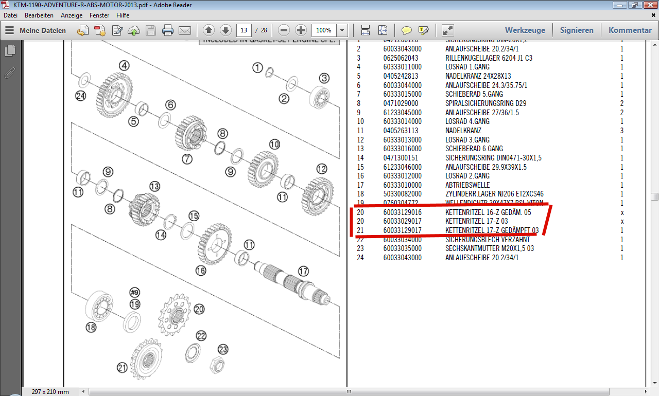 Im Ersatzteile-Katalog wird hinten nur ein 42iger angeboten, ganz im Gegensatz zu dem Vorderrad, da kann man, wie gesehen oben in der Zeichnung, ein 17er oder 16er Antriebsritzel ordern.
