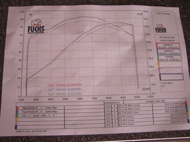Mein 990er Motor (aber mit Vergasern betrieben) hat mit offenem Luftfilter 112 PS und knapp 105 NM am Hinterrad, da geht also schon noch was Wink