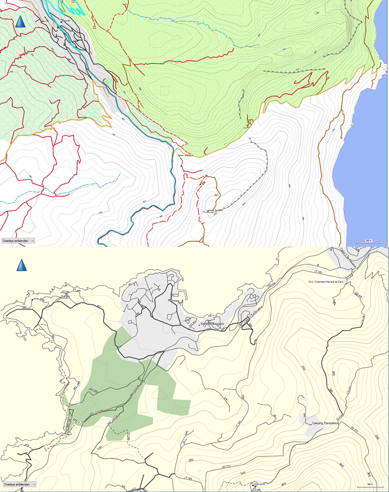 Ich werde im Mai nach Korsika fahren und Suche noch eine geeignete Karte für mein Garmin Navi. Ich habe bisher gute Erfahrungen mit den Open MTBmaps gemacht auf welchen man auch nette unbefestigte Wege findet. Allerdings sieht die Openmtbmap France (Bild unten) anders aus als die gewohnte von Italien (Bild oben).