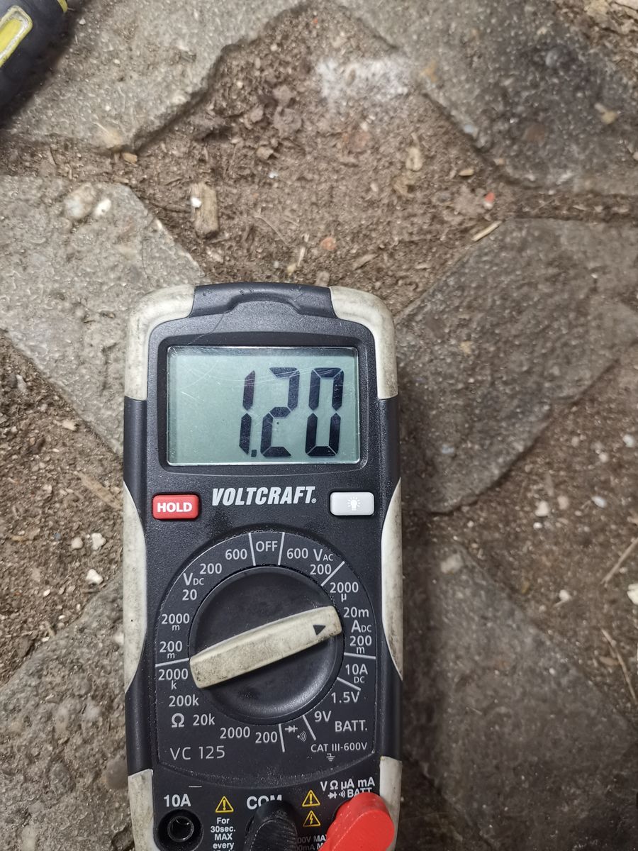 Multimeter schwarz auf Batterie + / multimeter rot auf schwarzes Kabel welches an Batterie - gehen würde