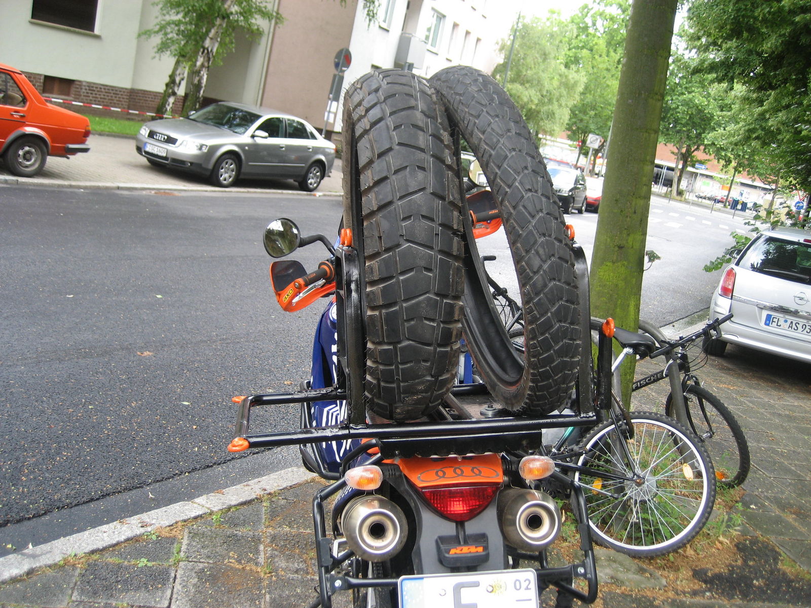 Vorderrad liegt auf nem 2,5cm dicken, mit nem alten Schlauch überzogenen Brett auf der Givi Topcaseträgerplatte.
