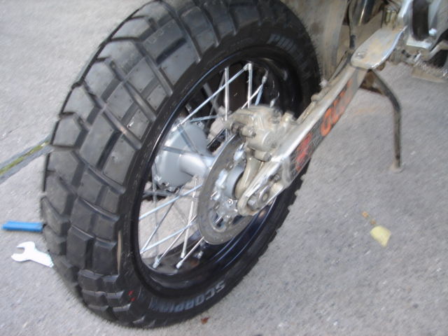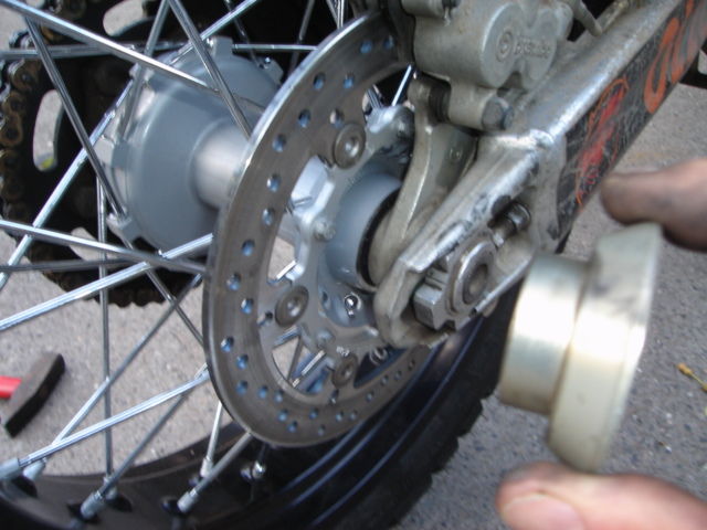 revidiere 990 Hinterrad passt nich in 950 Moped - wegen des ABS hat KTM die Schwinge verbreitert und somit muß man die Buchsen des 950er Rades nehmen und dann paßt die Achse - beim einbau müssen noch 2 der 6 Schrauben der Bremsscheibe demontiert werden da diese nicht mehr in der Scheibe gesengt sind -dann geht es an der aufnahme der Bremszange vorbei und es schleift nix - 2 schrauben wieder rein und schön - nun habe ich auch eine Schwimmende Scheibe Neu Hinten .....