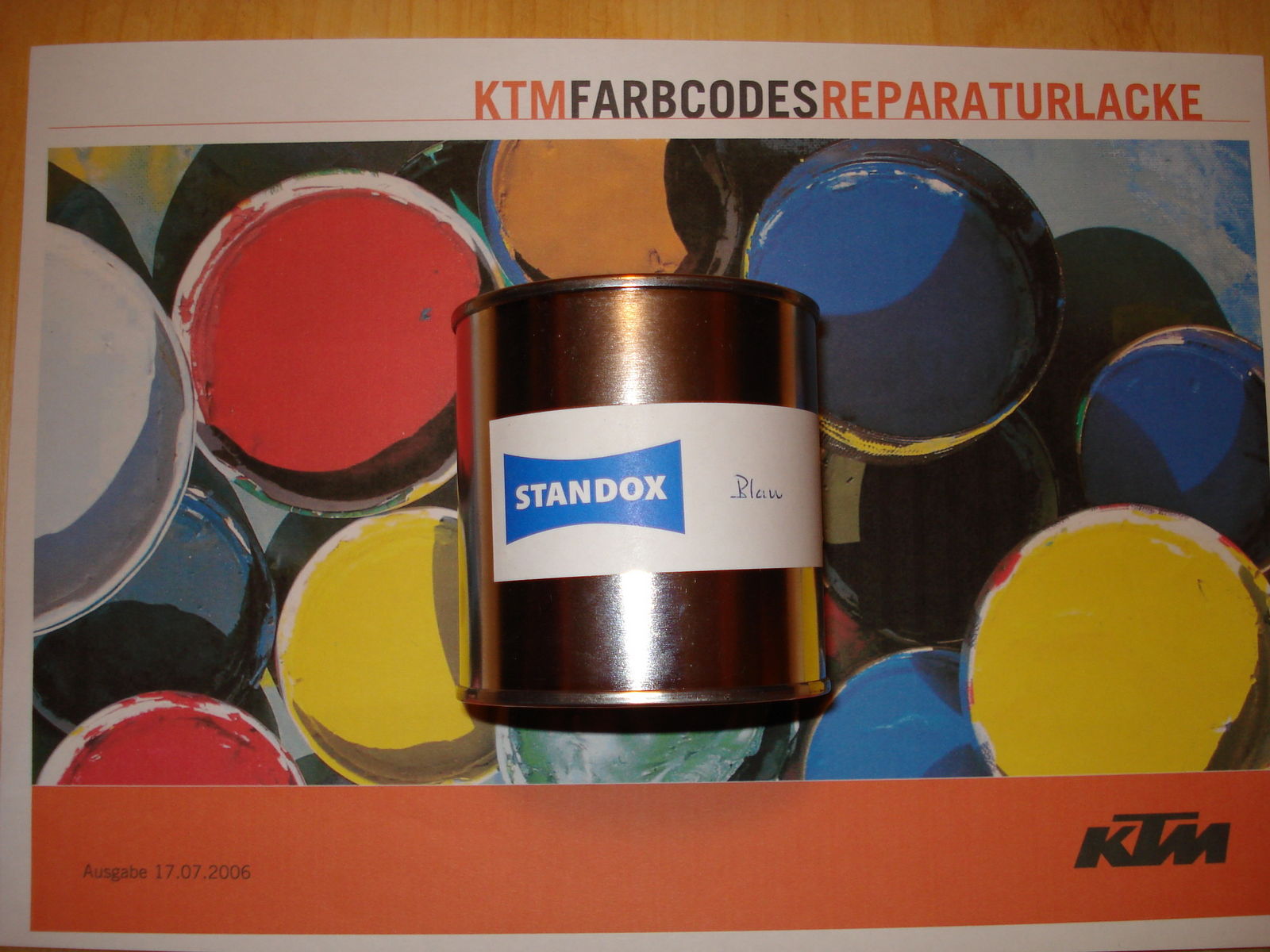 ... und beim Sommer den KTM-Reparaturlack Nr.30610 bestellt. (Der übrigens von Standox ist und nicht von DuPont wacko )