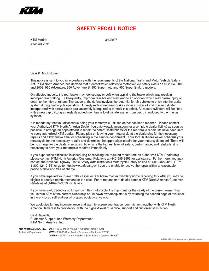 Safety Recall Notice "Rear Brake" Adv, SM, SE