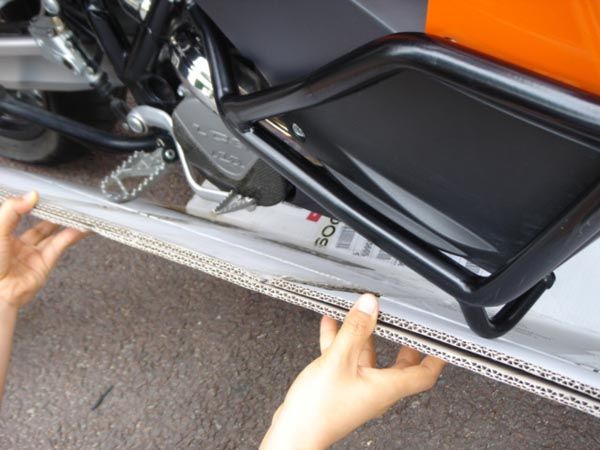 ich habe mal eine große pappe genommen und unten als ansatzpunkt die mitte des vorderreifens genommen. (so genau es eben geht. wir haben immerhin jemanden draufgesetzt.) dann die pappe langsam gleichmaßig nach oben biegen und sehen, was zuerst anstößt. ich habe mal ein photo gemacht und für mich sieht es so aus, als würden tatsächlich fußrasten und sturzbügel fast auf gleicher höhe liegen. so genau ist die methode natürlich nicht, aber eines ist ganz deutlich klar: selbst wenn die pappe bei fußrasten und sturzbügel schon anliegt, ist noch platz bis zum bremshebel. wenn kanntnschleifer den schon angekratzt hat müßte auch der sturzbügel aufsetzen, oder nicht?
