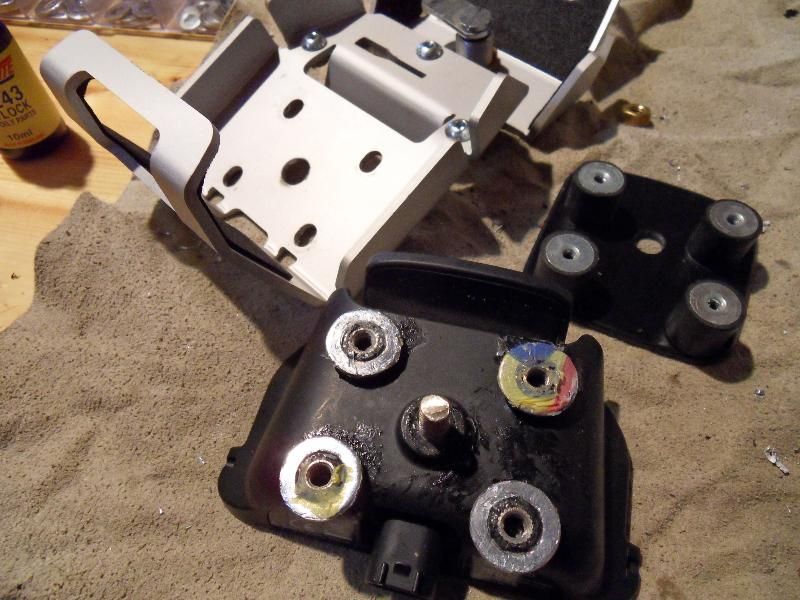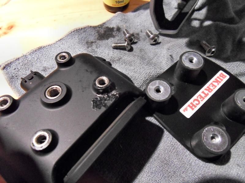 Habe mir vor 2 Jahren von "Bikertech" ein Zwischenstück (mit Gummi-Puffern) für die Ram Halterung der TomTom Aktivhalterung gekauft (siehe Bild 1). Da meine Halterung bereits Risse im Plastik neben den Gewinde-Buchsen hatte (durch die Schläge auf Schotterwegen), mußte ein stabilerer Umbau her. Habe mir dazu 4 Beilagsscheiben genau auf den Durchmesser der Plastik-Einfassung der Gewindebuchsen aufgebohrt, diese dann darüber gedrückt und vorher gut mit Sekundenkleber bestrichen. Somit können die Schrauben, bei Belastung durch Schläge, nicht mehr das Plastik rund um die Gewindebuchse sprengen. Außerdem ist in der Aktivhalterung mittig noch ein großes Messinggewinde. Dort habe ich eine Schraube eingedreht und ebenfalls mit Sekunden-Kleber verklebt (ich glaube es war eine M8, bin aber nicht mehr sicher )....vorher aber genau die Tiefe der Bohrung messen, da man sonst beim Eindrehen das Plastik sprengen kann. Den Kopf der Schraube abgeflext (darauf achten das die Schraube nicht zu heiß wird, sonst löst sich das Messing-Gewinde im Plastik......also mehrmals ansetzen zum Abflexen!) und ein Loch in die Mitte des "Bikertech" Adapterstückes gebohrt (Bild 2).