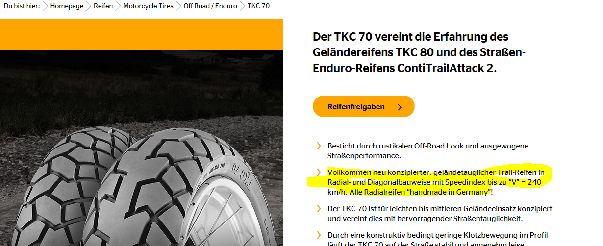 DER TKC 70 hat einen Geschwindigkeitsindex "V" also bis 240 km/h zugelassen, deshalb auch die Begrenzung der "R" Modelle ab 2018 auf 228 km/h...