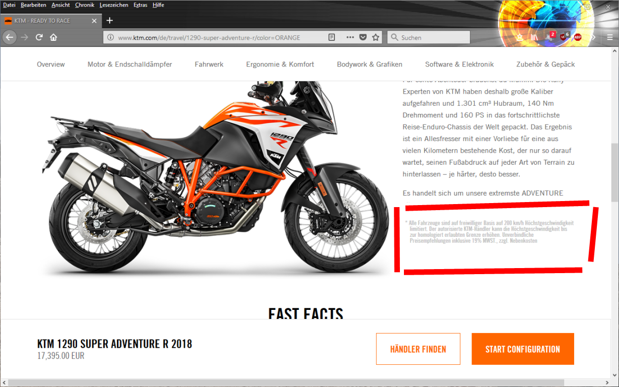"Alle Fahrzeuge sind auf freiwilliger Basis auf 200 km/h Höchstgeschwindigkeit limitiert. Der autorisierte KTM-Händler kann die Höchstgeschwindigkeit bis zur homologiert erlaubten Grenze erhöhen. Unverbindliche Preisempfehlungen inklusive 19% MWST., zzgl. Nebenkosten"