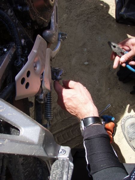 Nachdem die Teterete nach 8-10 Versuchen tatsaechlich mal abgehoben hat, ist bei der Landung die rechte Fussraste gebrochen. War nen guter Stunt, aber sonst nix passiert.