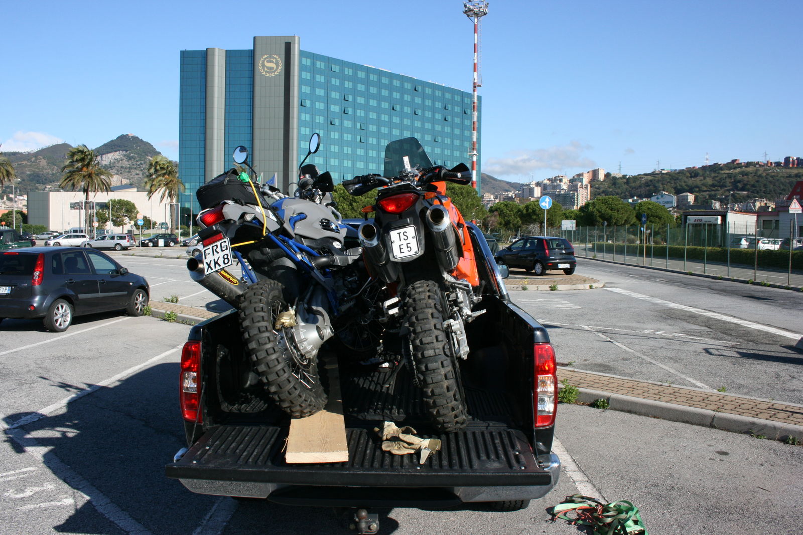 Hallo - im Zug und auf dem Schiff hast du keine Stösse, die beim Fahren mit Hänger oder auf dem Pick Up (von Gelände schon mal abgesehen) entstehen. Beim Verzurren im Autozug und auf der Fähre kann man schon drauf achten, daß der meiste Zug auf der gegnüberliegenden Seite des Ständers liegt.