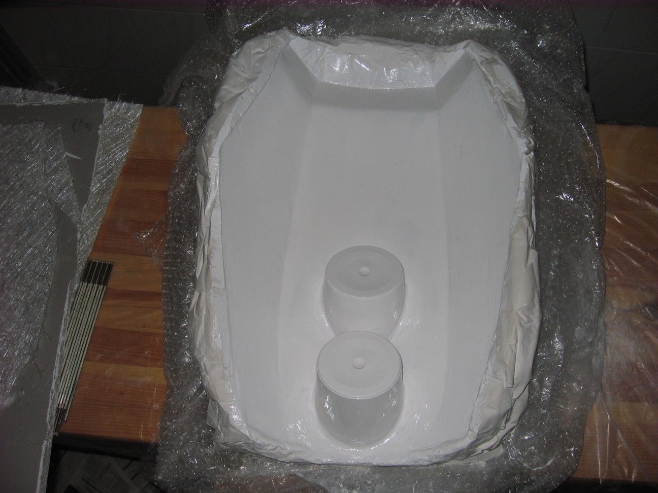 Die Form hatte ich aus Modellgibs gegossen, war aber nicht so Clever. Das laminierte Teil blieb beim Endformen an den Lampenöffnungen hängen und dann musste ich mit dem Hammer dran. Wink