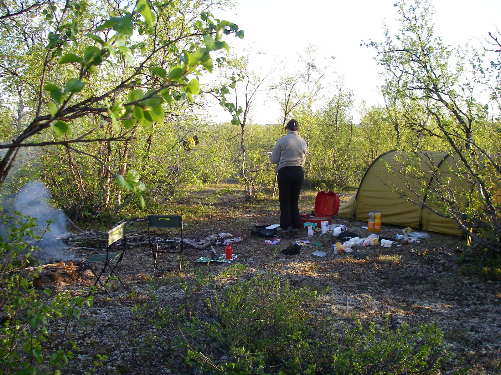 Vorbei wars mit der Mitternachtssonne. Dafür schaute jetzt vertraut der Vollmond durch die Äste und warf sein Spiegelbild auf ´s Wasser. Am nächsten Morgen ein letztes Mal die Küche einräumen.