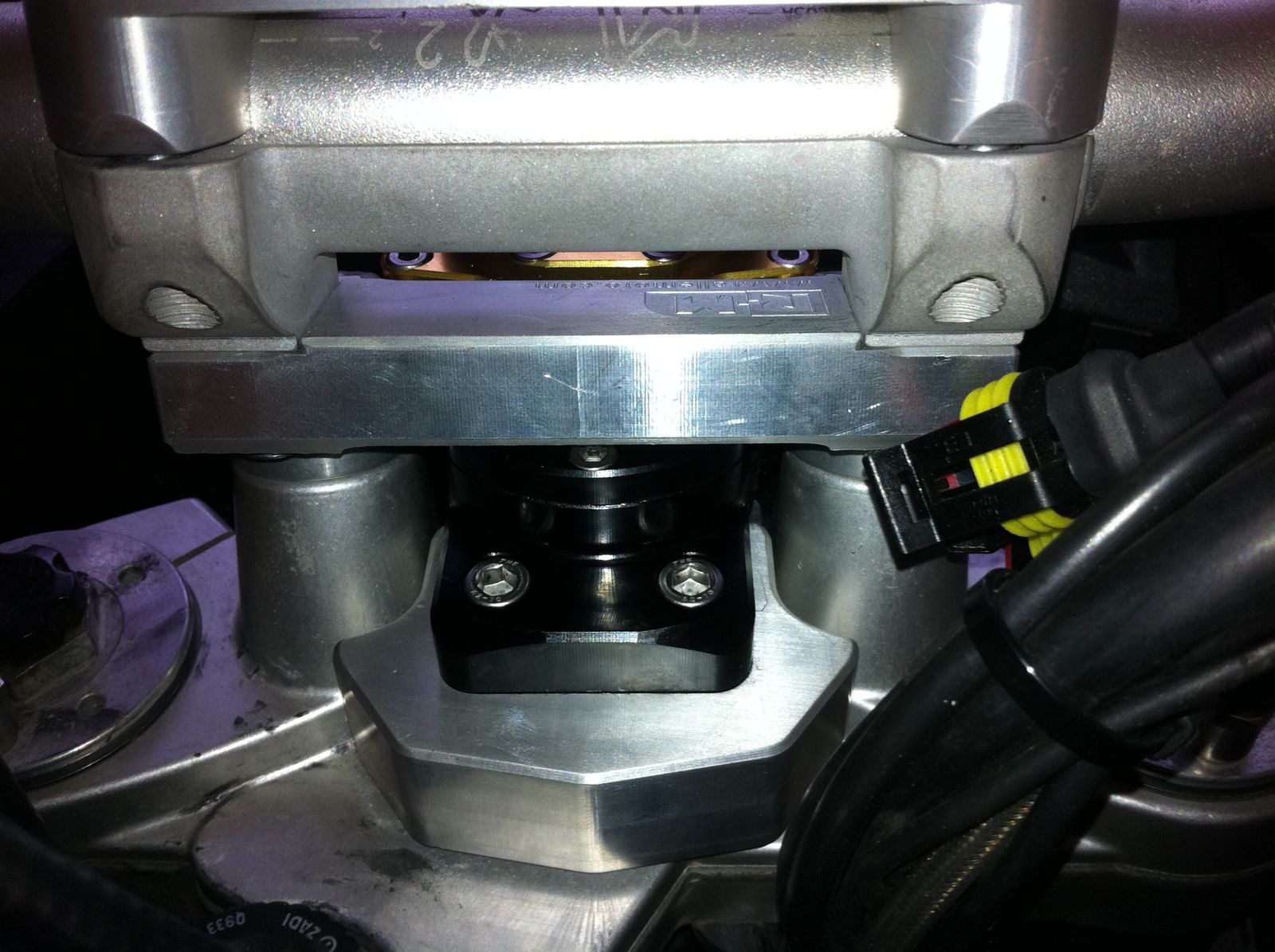 Die Gewinde der Alugrundplatte sind bei mir rausgeflogen... d.h. ausgebort und den Lenkungsdämpfer mit längeren Schrauben an der Gabelbrücke befestigt (Gewinde sind schon vorhanden). Wollte die Trägerplatte nicht nur mit der Lenkkopflagerschraube befestigen... die Aluaufnahme passte bei mir leider eh nicht zwischen die Aufnahmen, so dass leichte Nacharbeiten mit der Feile notwendig waren.