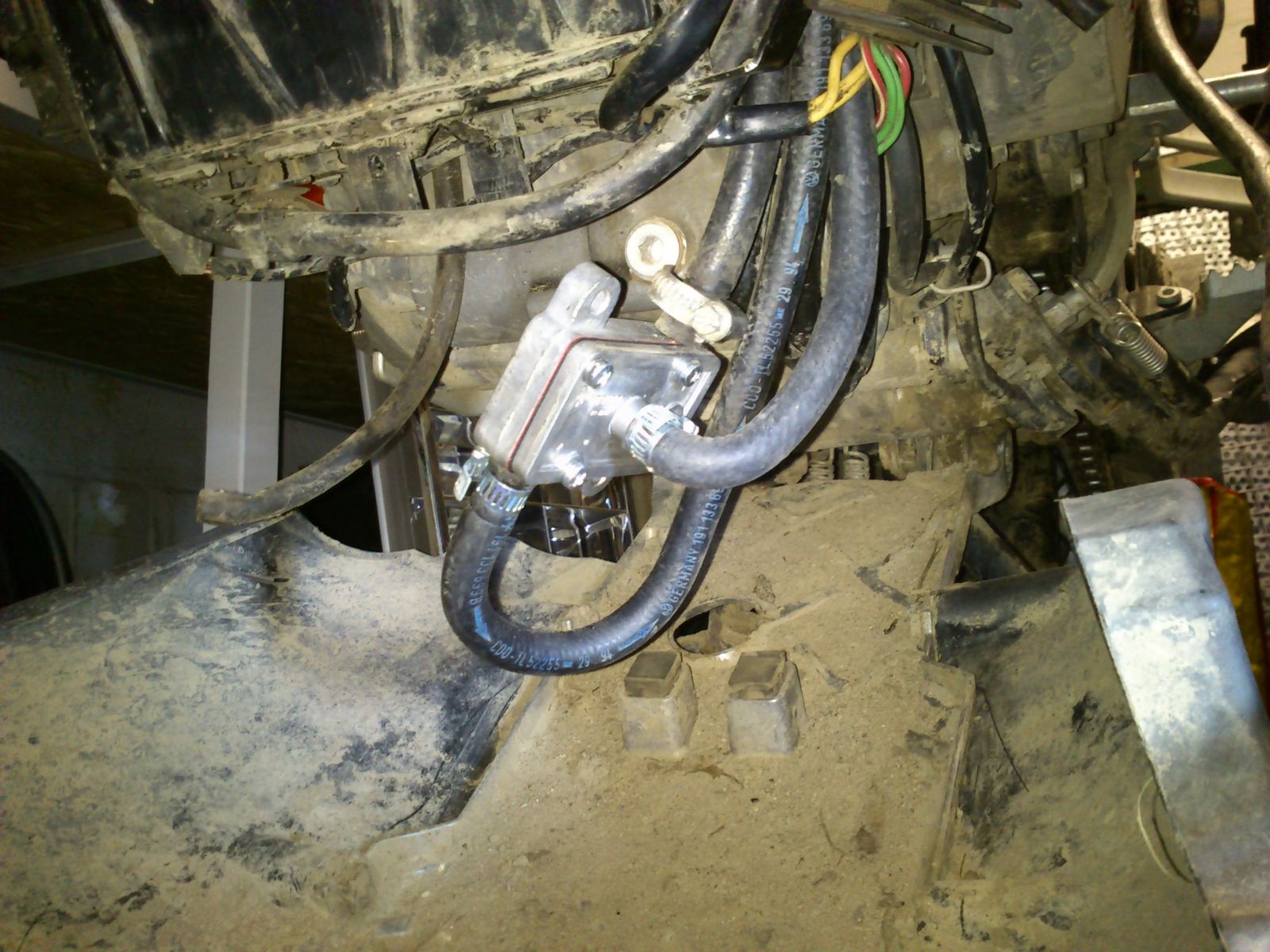 So das der Bogen nach unten zeigt. Den dicken Schlauch gab ich dann unten in der nähe des Benzinhahnes eingekürzt. Dann den originalen dünnen Benzinschlauch in den dicken reingeschoben und Schlauchschellen drum.