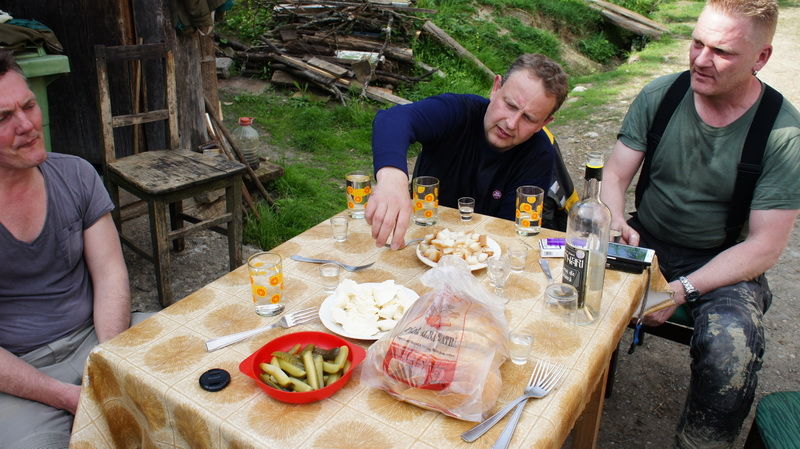 Fetter Speck, Brot, Kuhkäse, Salzgurken, Einfachbrannt und Doppelbrand beim Revierförster