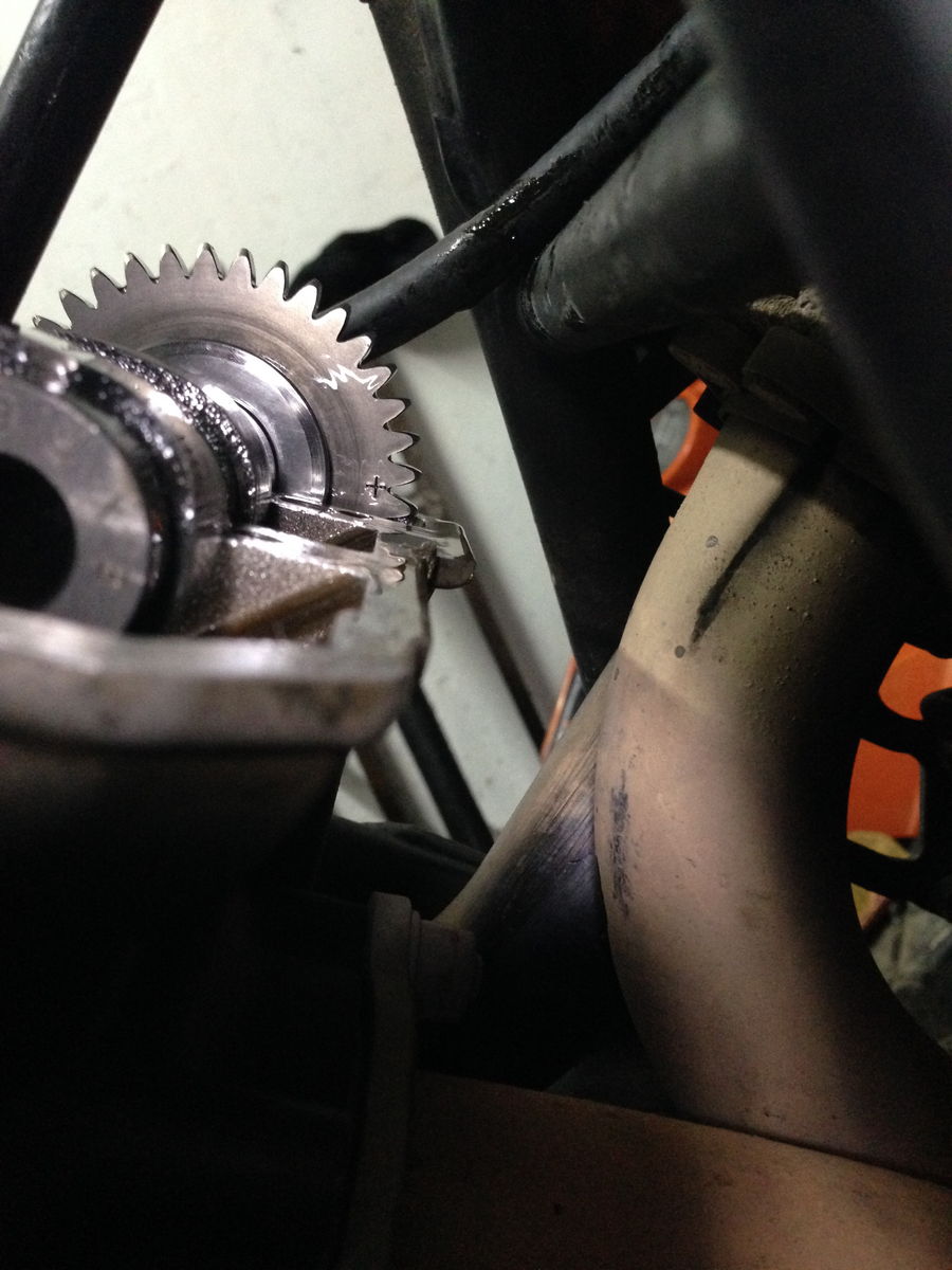 und hier von der Auslasswelle. Sehr merkwuerdig finde ich, dass laut Anleitung das Kreuz AUF dem Zahn ist, bei mir aber genau DAZWISCEHN.