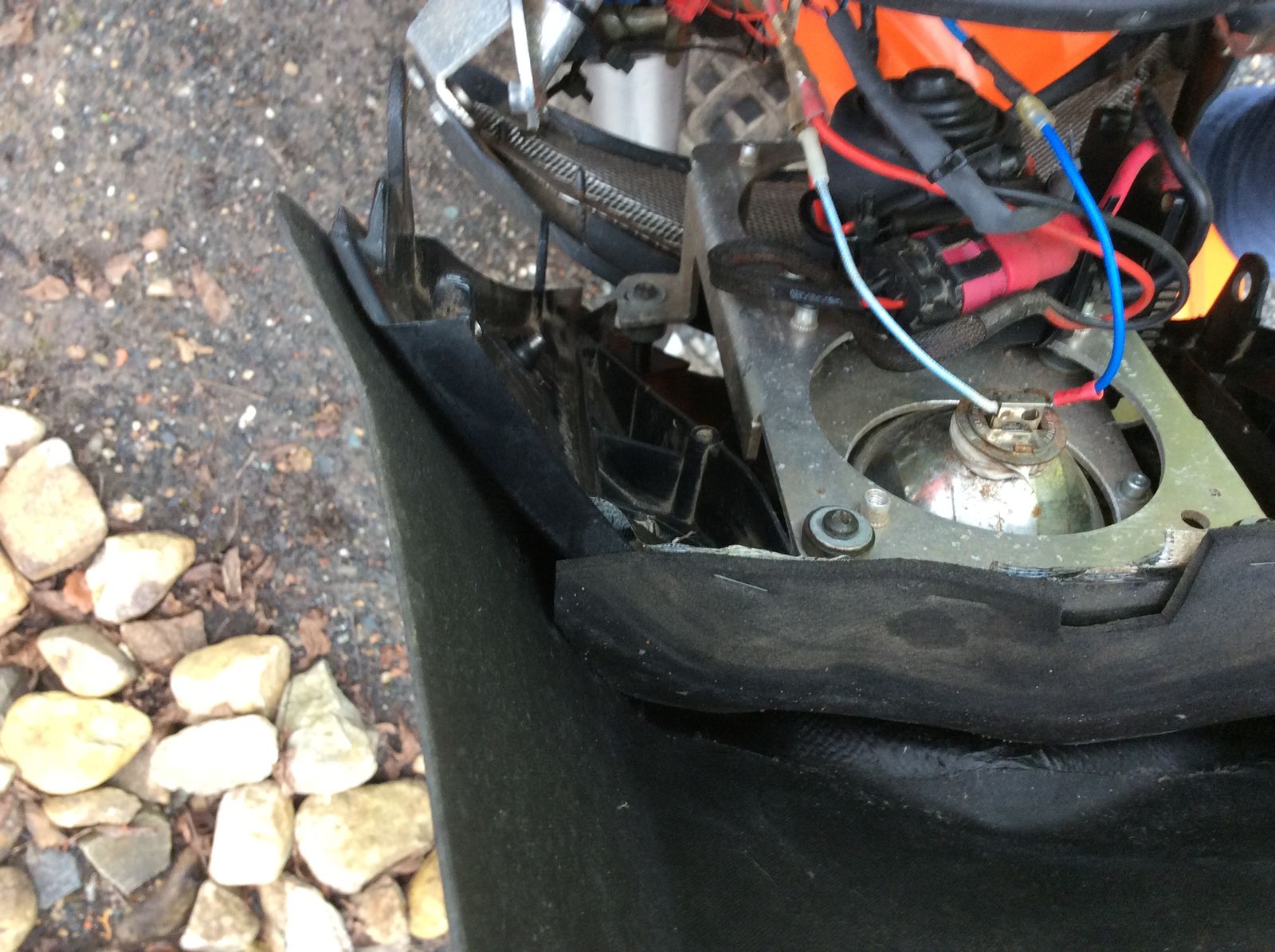 Hab das Panzerband in die Spalten des Kunststoff reingefriemelt. Weil das Tape auf dem Schaumstoff nicht dauerhaft hält, mit dem Tacker fixiert. Das Cockpit deckt die Bastelei von oben ab. Wollte erst schön bündig in einer Ebene an die Maske anschließen, das hat aber nicht geklappt wegen der Innenwölbung vom Scheinwerferausschnitt. Sieht auf den Fotos ziemlich wild aus, erfüllt aber den Hauptzweck, dass das Scheinwerferlicht im Dunkeln nicht durchkommt. Wasserdicht ist es nicht, aber durch den Überhang der Maske muss man sich schon Mühe geben einen Schwall Wasser hinter die Maske zu kriegen. Muss jetzt im Frühjahr mal wieder sauber verklebt werden und sieht dannnauch wieder ok aus
