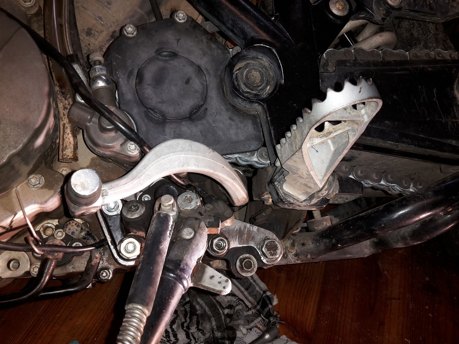 Es hat eine Dicke von 6mm, glaube ich und ist ebenfalls aus rostfreiem Material. Abweichend von den käuflichen Varianten habe ich die Geometrie im hinteren Teil etwas abgeändert. Damit konnte ich eine Nut einsägen, welche in eine Rippe am Rahmen eingreift (hinter der Fußrastenaufnahme). Damit wollte ich die Belastung der Motortragschrauben bei abgestellter Maschine verringern.