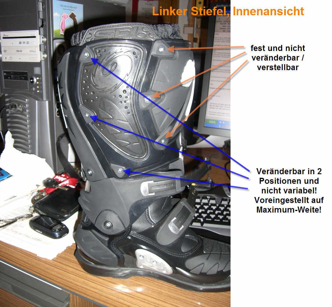 Ansonsten habe ich mir vor 10 Jahren die Alpinestars GP-Stiefel (Strasse) gekauft, da habe ich damals sogar die Lederhose mit rein gekriegt. Und vor zwei Monaten ein paar Dainese-Stiefel (auch Strasse), die kriege ich auch ganz gut zu.
