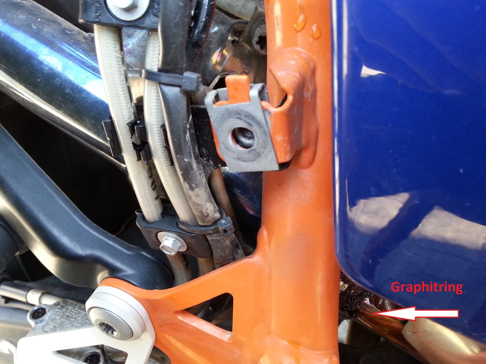 Zwischen den "Auspuffrohr vorne" und dem "Auspuff Verteilerrohr LC8" ist eine Schellenverbindung. Diese Schelle ist fest, nur dürfte es durch die Vibrationen beim Fahren irgendwie passiert sein, dass der "Graphitring" sich gelockert hat, und nach unten gerutscht ist. Somit ist das "Auspuffrohr vorne" nicht mehr fix mit dem "Verteilerrohr" verbunden und ich habe an jeder Seite ca. 1cm Luft. Und genau dort bläst es jetzt die heißen Auspuffgase raus.