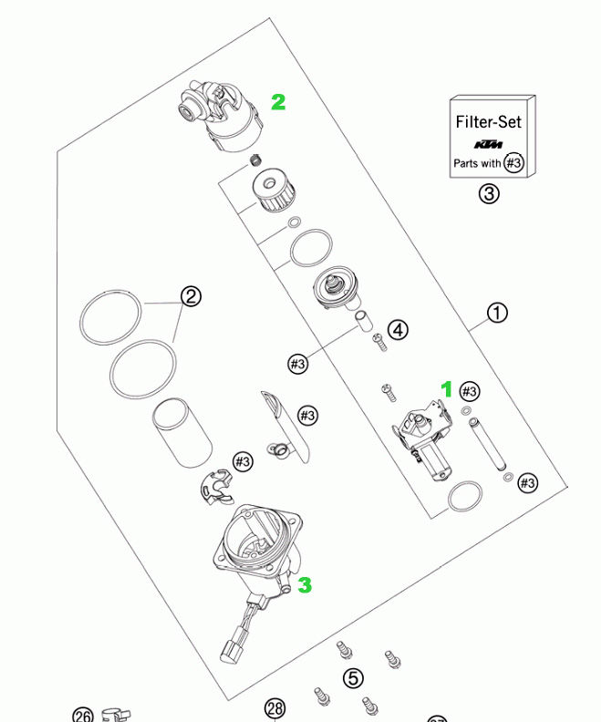 Der Halter (grüne 1) bricht, da er innen am Tank anliegt und die Vibrationen übertragen werden. Dadurch sitzt das Oberteil (grüne 2) schräg und der O-Ring dichtet nicht mehr ab. Die Pumpe fördert drückt den Kraftstoff aber auch durch die Dichtung. Das würde auch das Auslaufen des Kraftstoffes erklären wenn man den Benzinschlauch mit Schnellverbinder von der Pumpe (grüne 3) trennt.